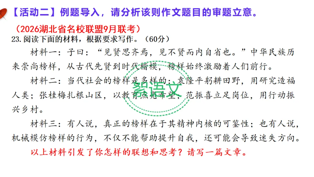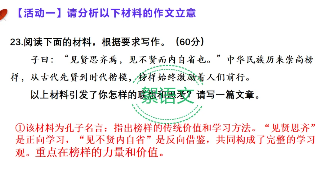 材料①:子曰:“见贤思齐焉,见不贤而内自省也。”立意:榜样具有传统价值,应正向看齐、反向自省,形成完整学习观。