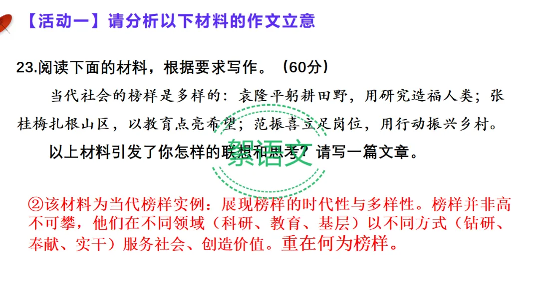 材料②:袁隆平、张桂梅、范振喜等当代榜样事例立意:榜样具有时代性与多样性,立足不同岗位实干奉献、服务社会。
