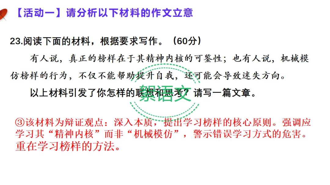 材料③:学精神内核,不机械模仿立意:学习榜样重在汲取精神内核,拒绝机械模仿,避免迷失自我。