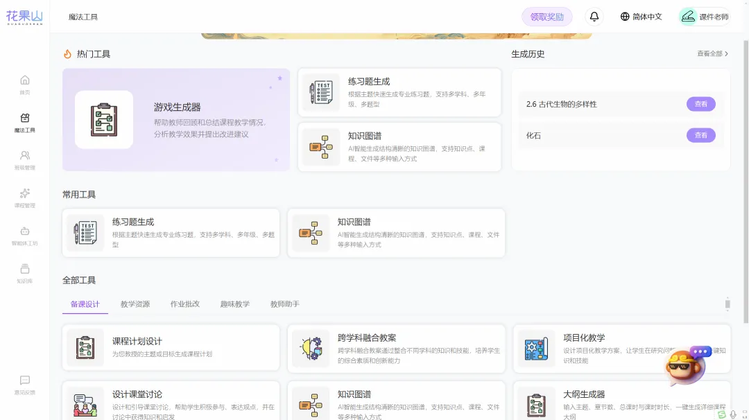 魔法工具栏目生成的内容非常丰富,涵盖备课设计、教学资源、作业批改、趣味数学和教师助手。