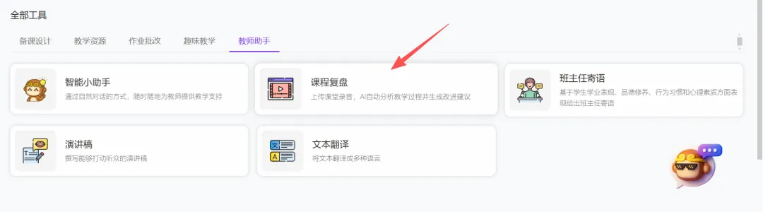 教师助手中的课程复盘功能可上传课堂录音,AI 自动分析教学过程并生成改进建议。这一点与老师前几天在微信公众号发布的那篇关于上传录音与AI进行课堂分析的文章,可谓异曲同工。