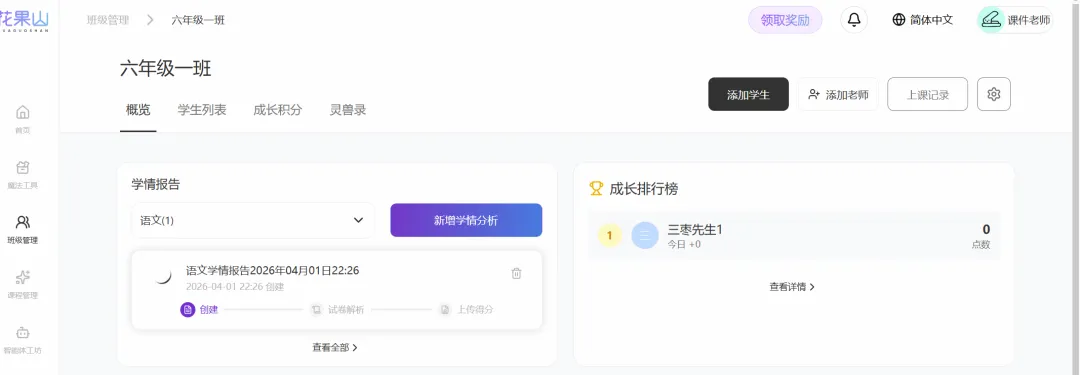 上传学生后,即可查看其最新的成长积分系统,以及当前最流行的养宠物评价也已加载。