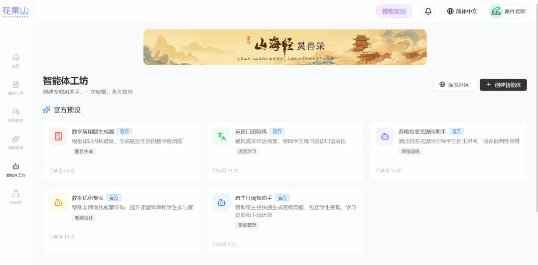 最后我们将智能体工坊和知识库结合起来看。智能体工坊集成了众多官方智能体,目前仍在不断开发中;同时支持自建智能体,实现智能体与课堂教学内容的融合。还与课件——也就是教学平台——融为一体,不再是零散、零碎的材料或应用,让我们不知如何整合进课件。
