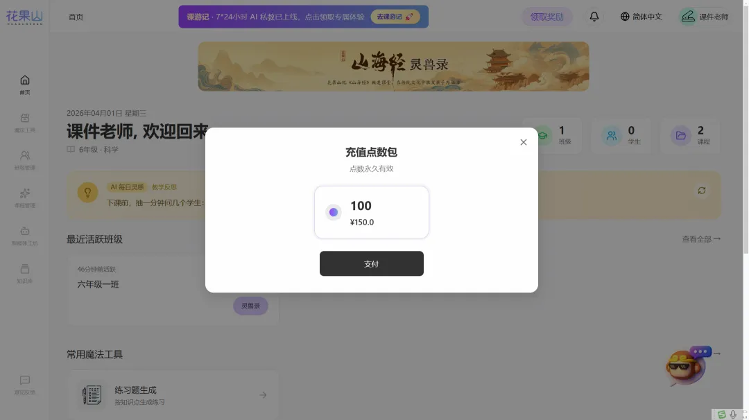 最后我们来看一下收费问题,每个账号都会赠送一定免费额度。充值点数价格较高,一百点需150元人民币,但课件老师初步判断,其价值非常值得。该平台真正将当前人工智能融入课堂,整合了智能题库、知识库等热点应用,形成完整解决方案。