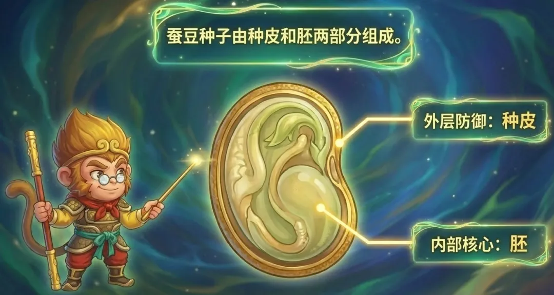 讲解种子内部结构时,课件以蚕豆种子为例,明确指出种子由种皮和胚两部分组成。种皮的功能是保护种子的内部结构,尤其是保护胚。胚被强调为种子最重要、最核心的部分,是未来植物发育的基础。