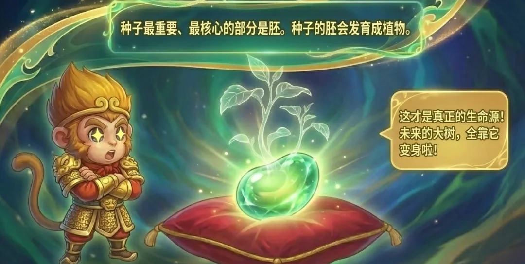 在导入环节通过孙悟空的变化能力与种子的生长潜力进行类比,能够有效激发学生的好奇心。从学生已有经验出发的导入方式,契合小学四年级学生的认知特点,还自然引出绿色开花植物几乎都是从种子开始新生命的核心概念。