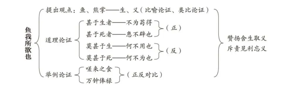 预设2:孟子用“鱼与熊掌”类比“生命与大义”,自然引出了“舍生取义”这个观点。(比喻论证、类比论证)通过正反对比,层层深入,反复论证义是人的本心,义重于生,当生命和大义不能兼得时,应“舍生取义”。(对比论证)