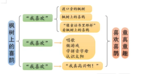 1、师:同学们,喜鹊是吉祥鸟、幸福鸟,能为我们带来吉祥。今天就让我们跟随著名童话作家郭风爷爷,一起去看看渡口旁的那棵枫树和枫树上的喜鹊是什么样子的吧。