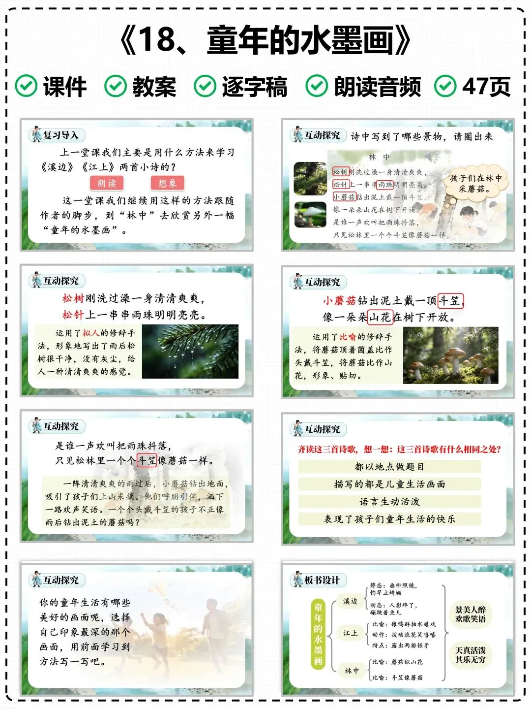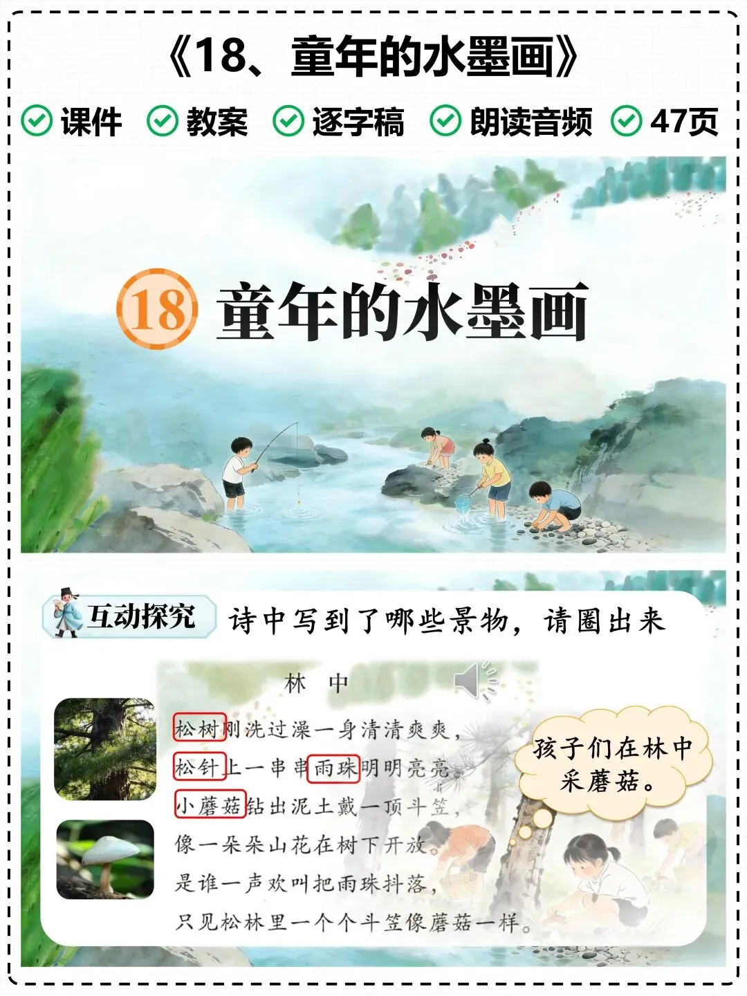 《童年水墨画》由溪边、江上、林中三个独立小节组成,每一节都是一幅纯净的童年画卷:溪边是垂钓的静谧与鱼儿跃出水面的欢喜,江上是孩童戏水的喧闹与无忧无虑,林中是雨后采菇的俏皮与亲近自然的乐趣。诗歌语言凝练、画面感极强,既能培养孩子的语感,又能引导他们感受生活中的美好,是三年级诗歌教学的重点内容。