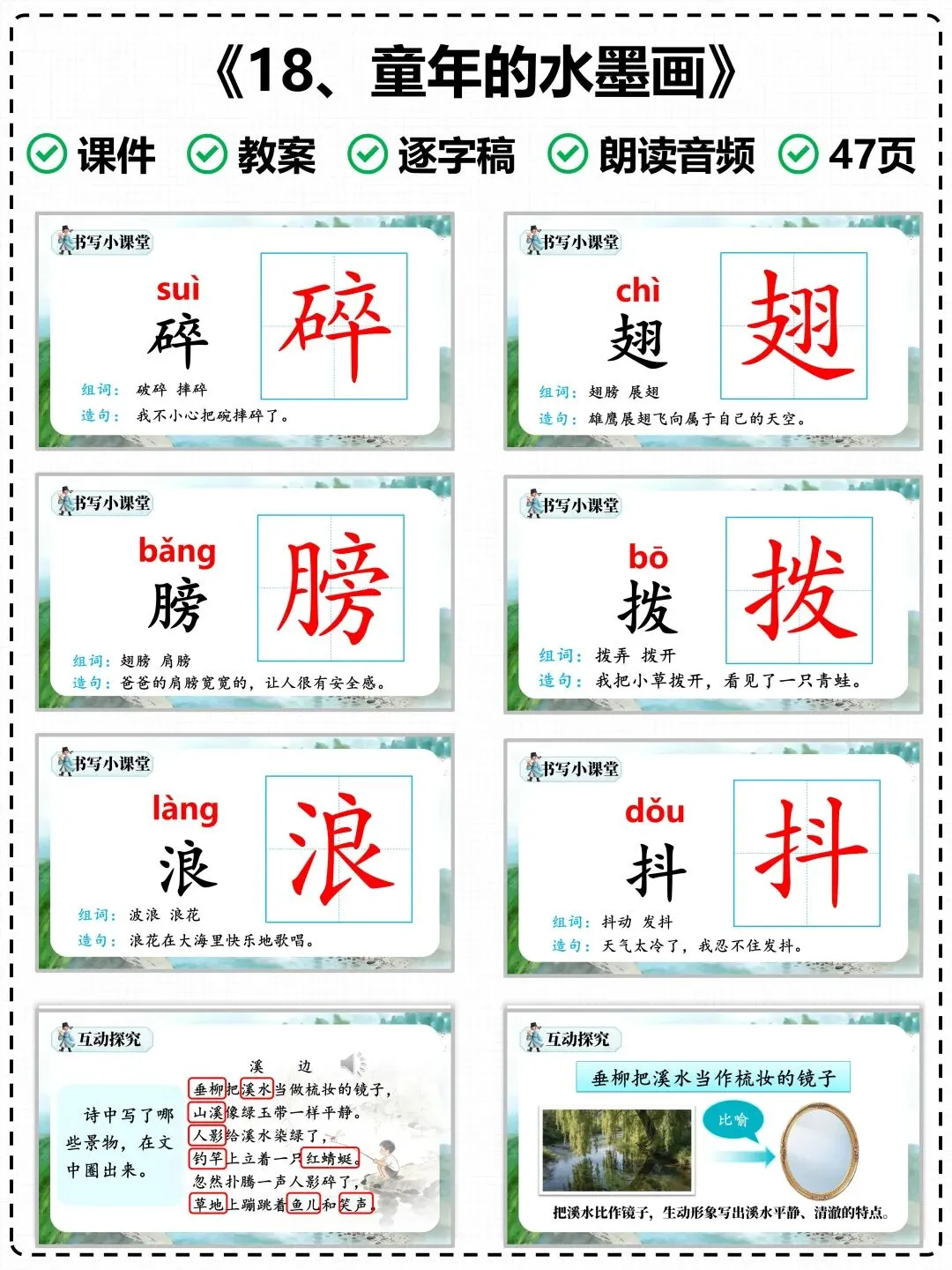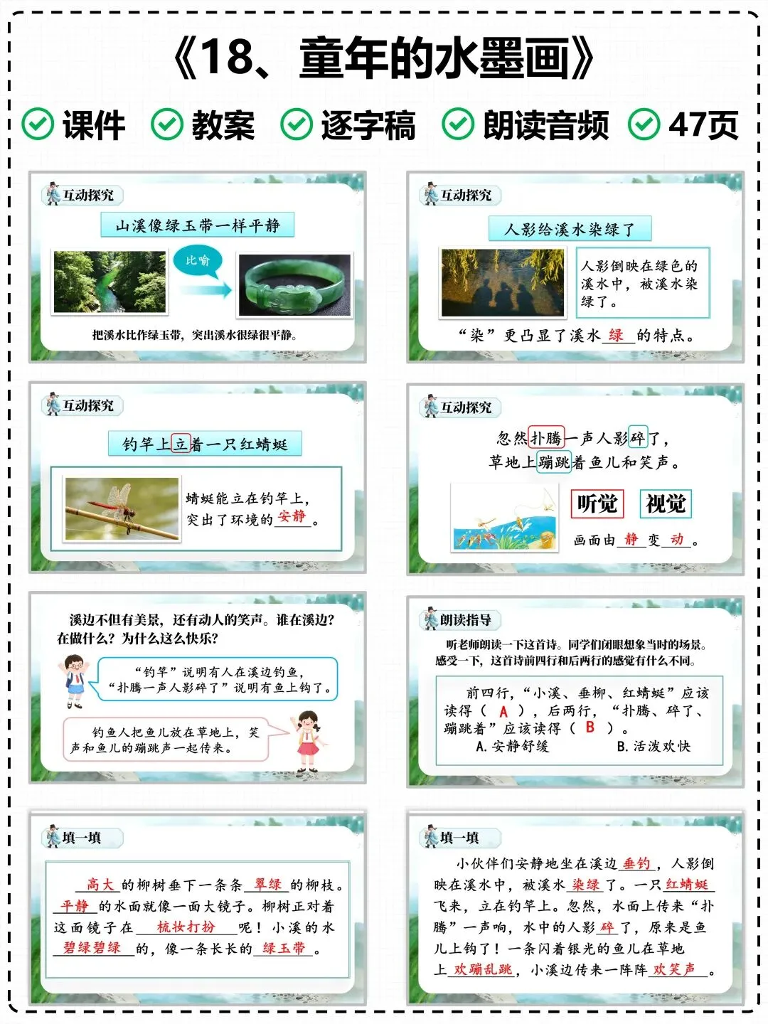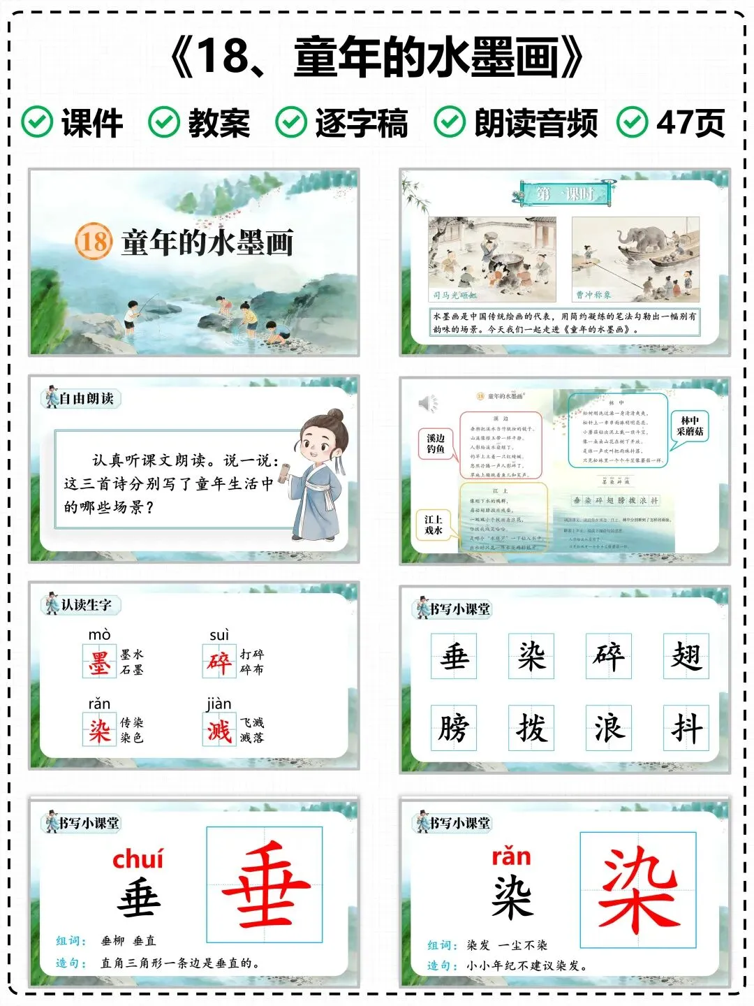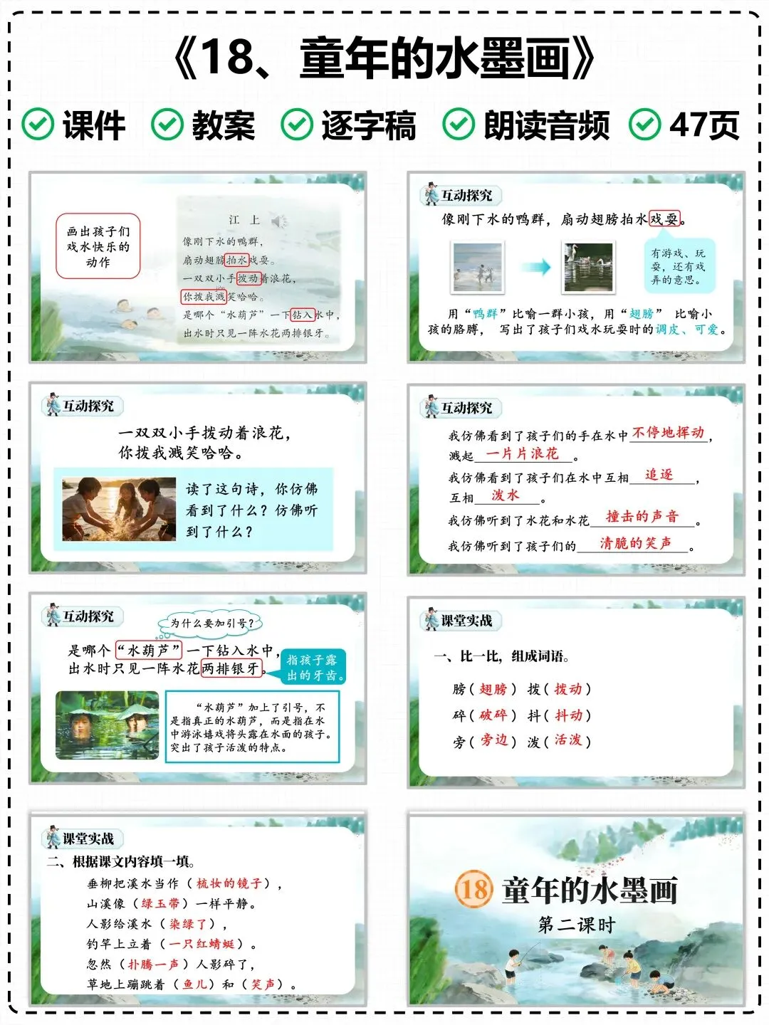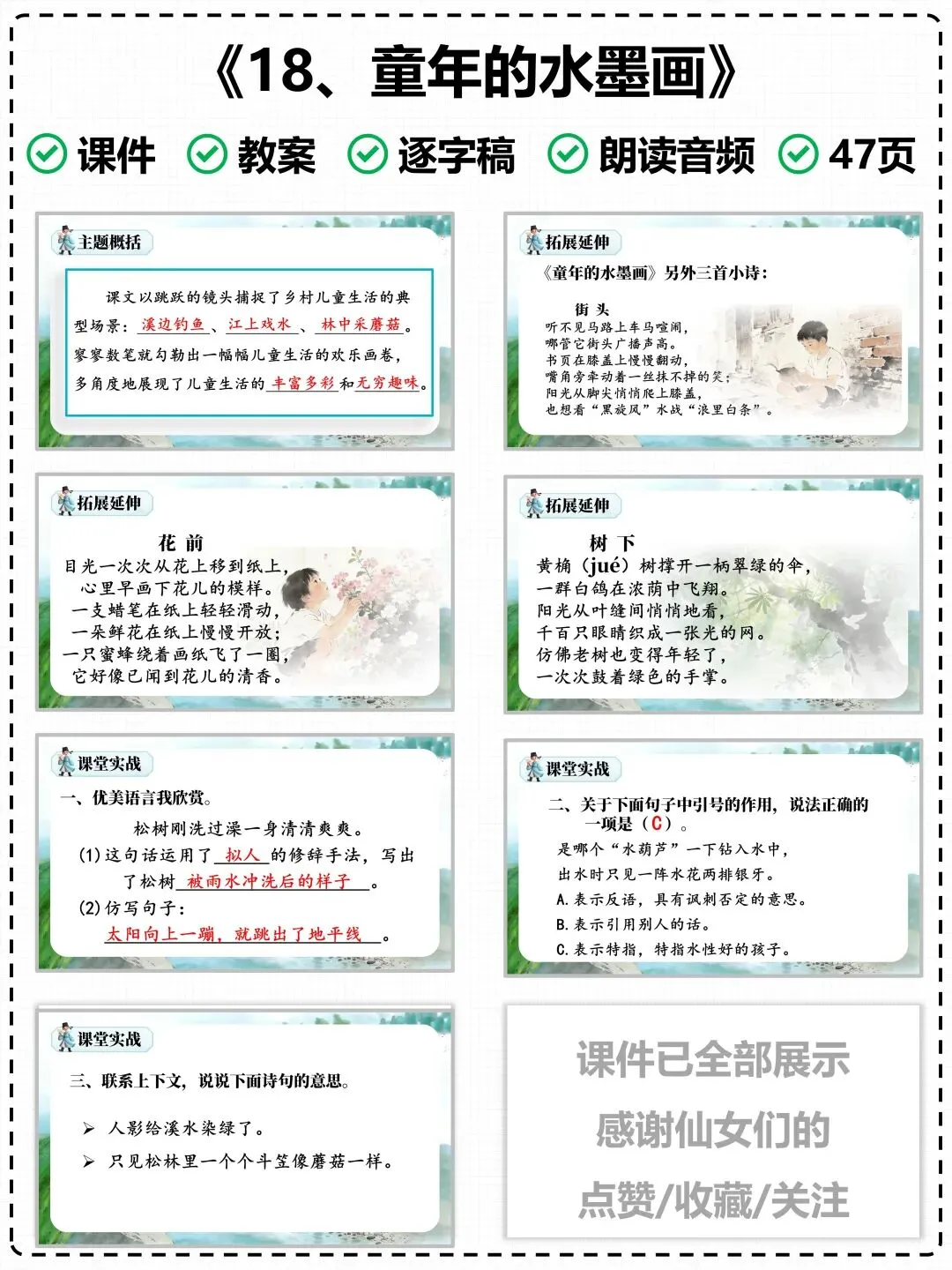 为了让老师们的课堂教学更高效、备课更省心,特意整理了这份《童年水墨画》专属教学课件,搭配清晰的图文讲解,紧扣课文重难点,完美适配课堂教学节奏,帮你轻松上好这节诗意语文课。