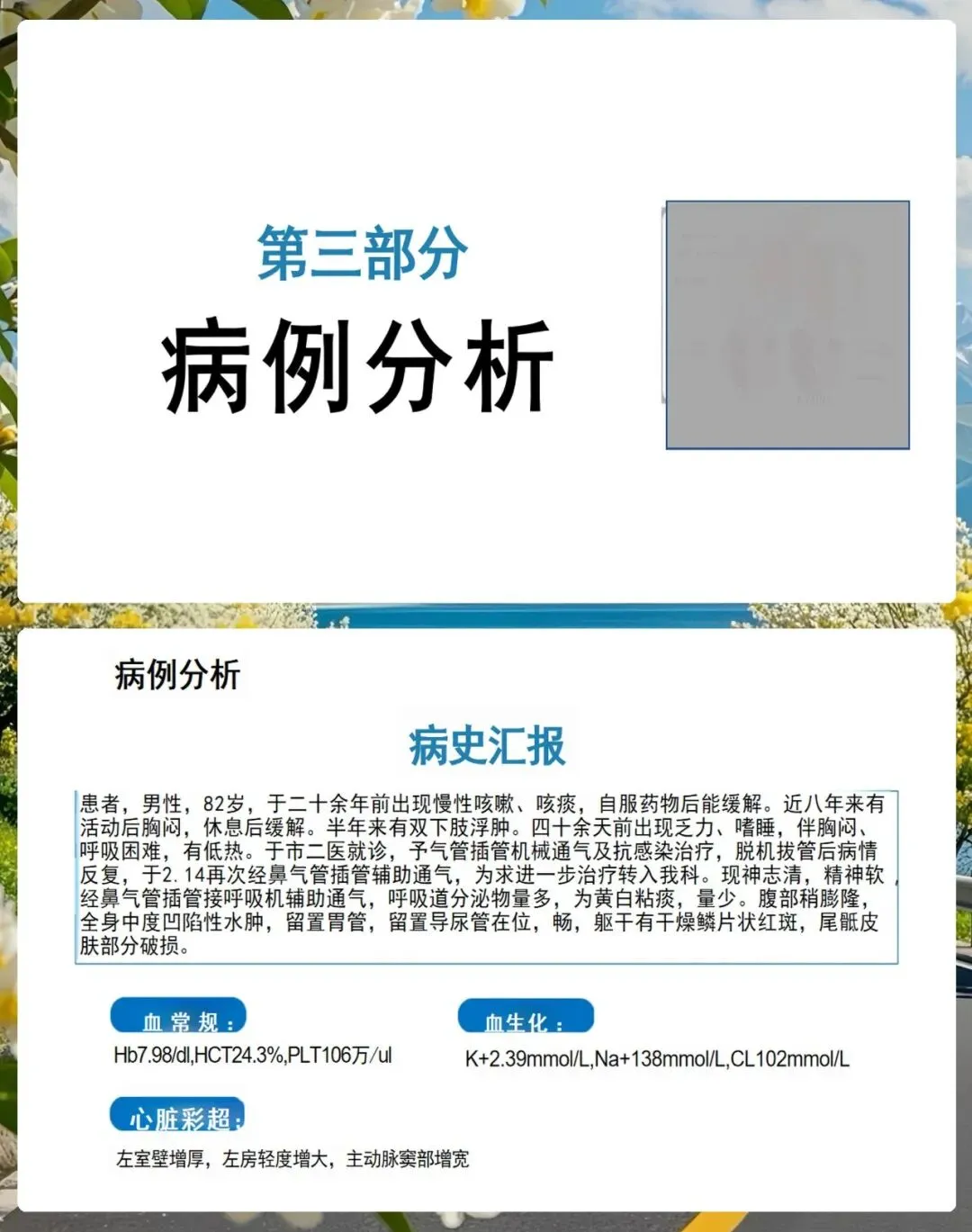 这位患者是一位八十二岁的高龄男性,病史非常长,有二十多年的慢性咳嗽咳痰史,近八年出现了活动后胸闷。