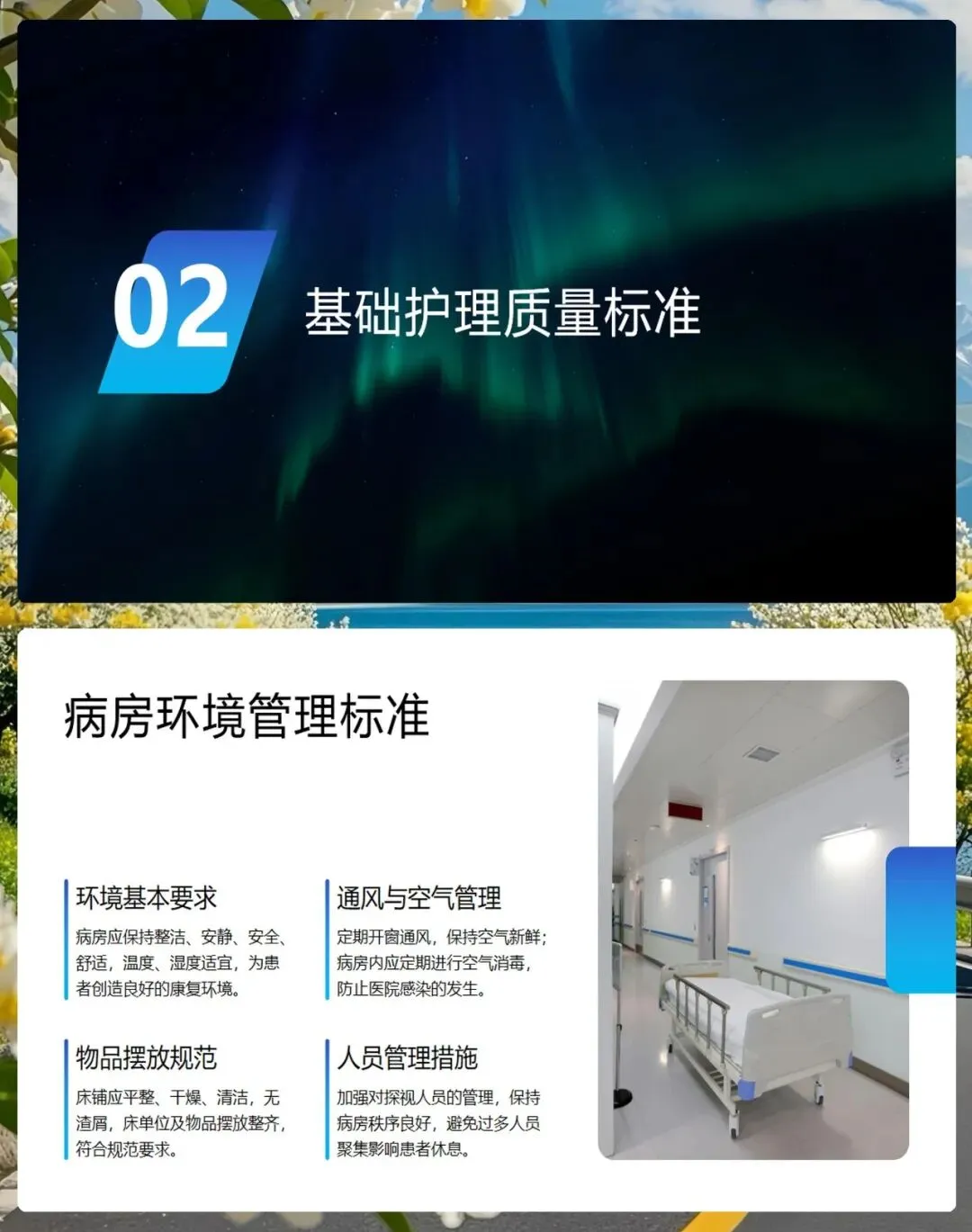 首先是病房环境管理。我们要为患者创造一个整洁、安静、安全、舒适的康复环境。