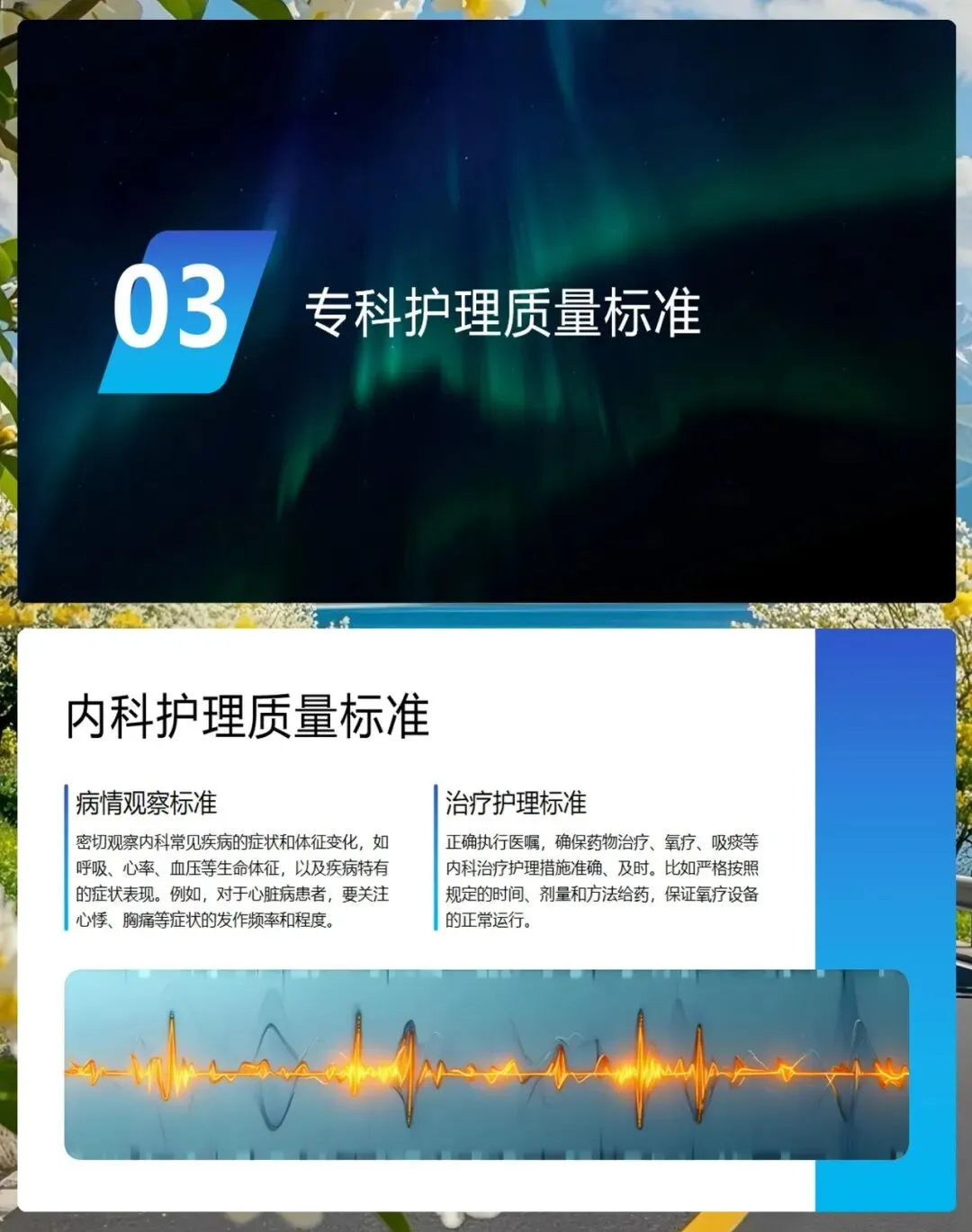 在内科,重点在于病情观察和健康教育。我们要密切监测呼吸、心率、血压等生命体征,特别是对于心脏病等慢性病患者,要关注特有症状的变化。