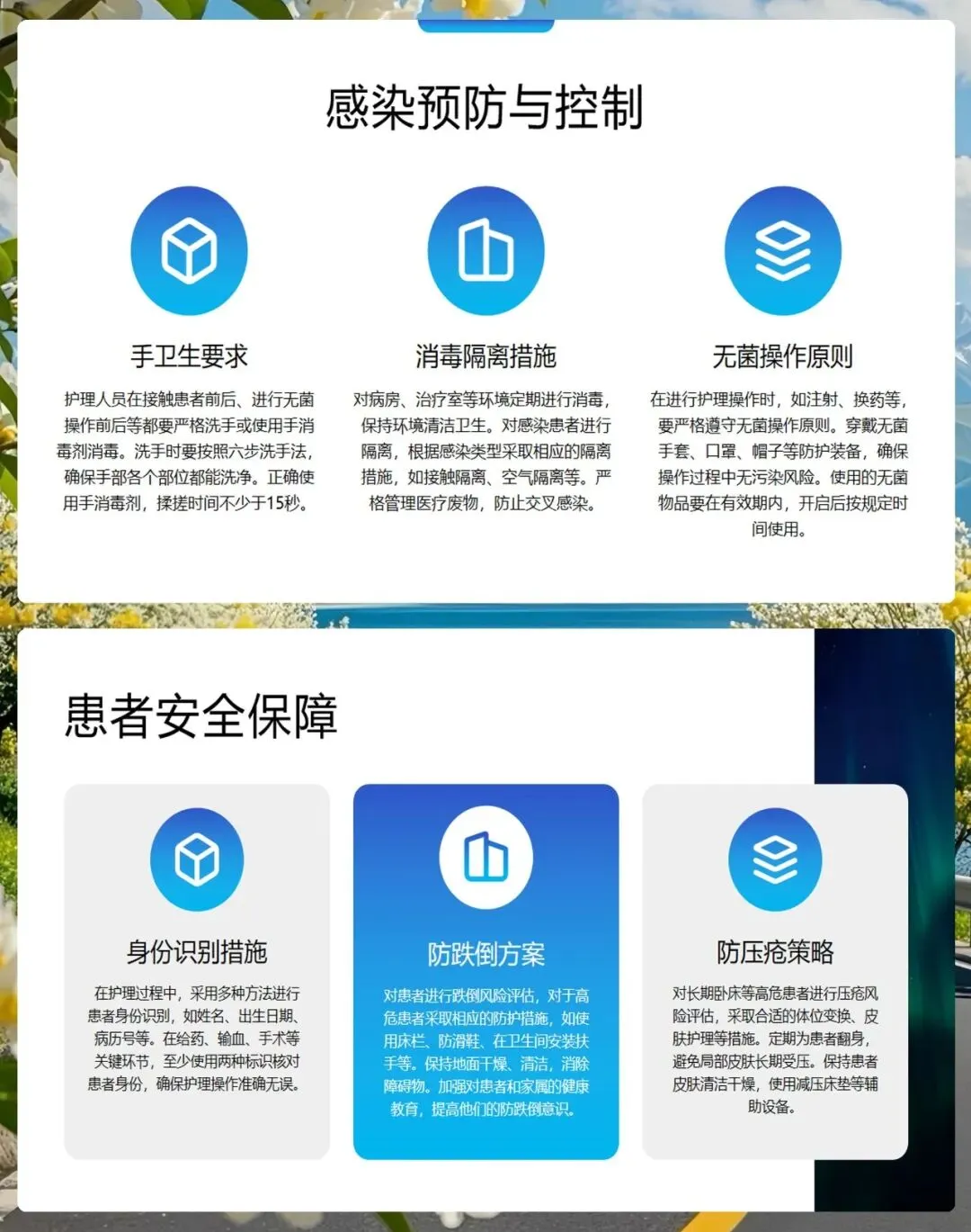 要做好防跌倒和防压疮工作,对高危患者进行风险评估,采取使用床栏、防滑鞋、定时翻身等措施,消除环境中的安全隐患。