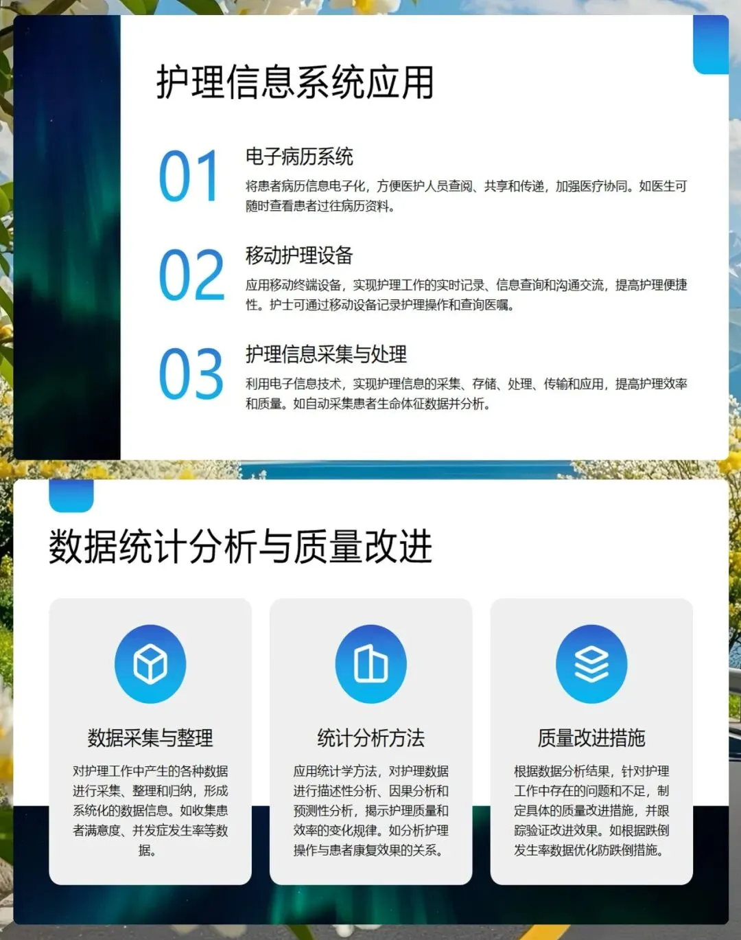 现在是信息化时代,我们要积极应用电子病历系统和移动护理设备。这些工具能帮助我们提高工作效率,实现信息的实时共享和采集。