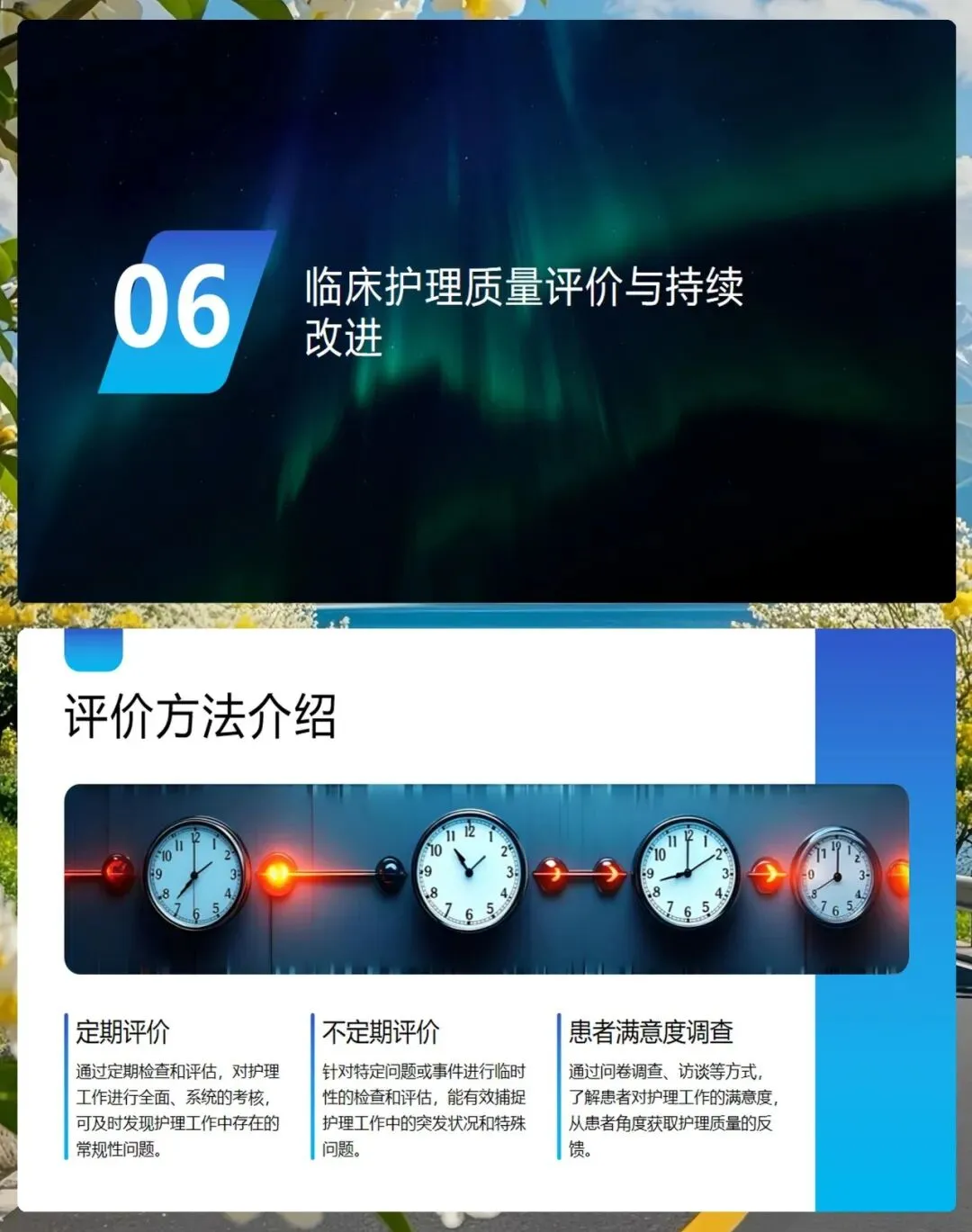 我们要建立科学的评价体系。评价方式包括定期评价和不定期评价,还要通过患者满意度调查来听取患者的声音。