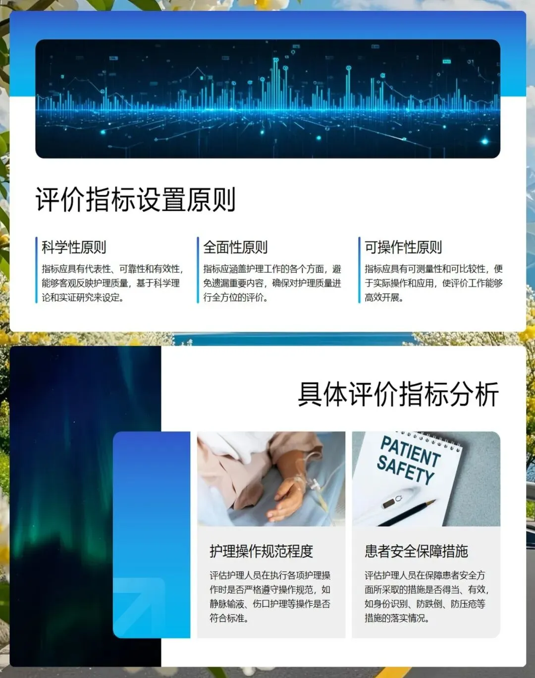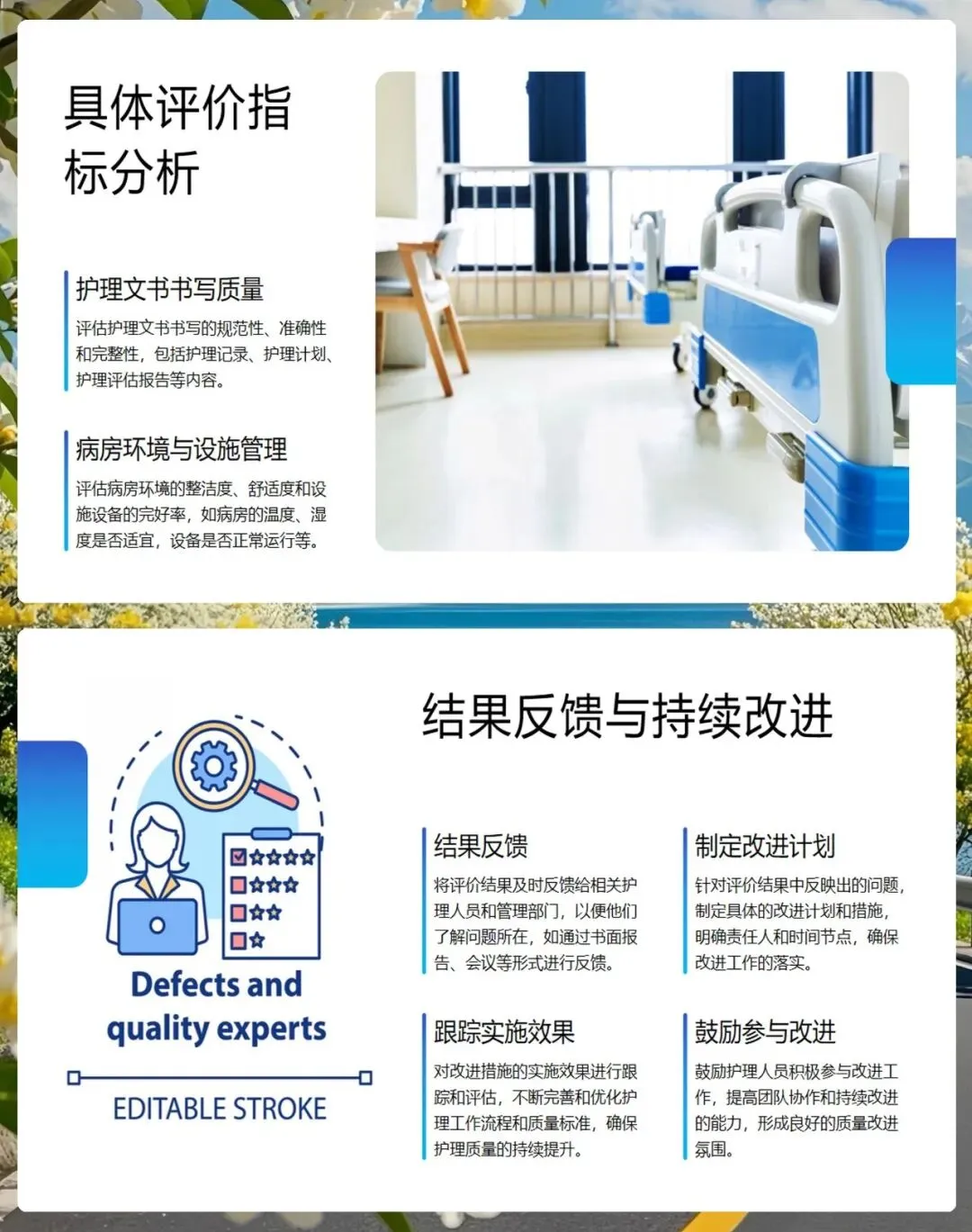 评价指标的设置要科学、全面且可操作,涵盖护理操作规范程度、患者安全保障措施、文书书写质量以及病房环境管理等多个维度。