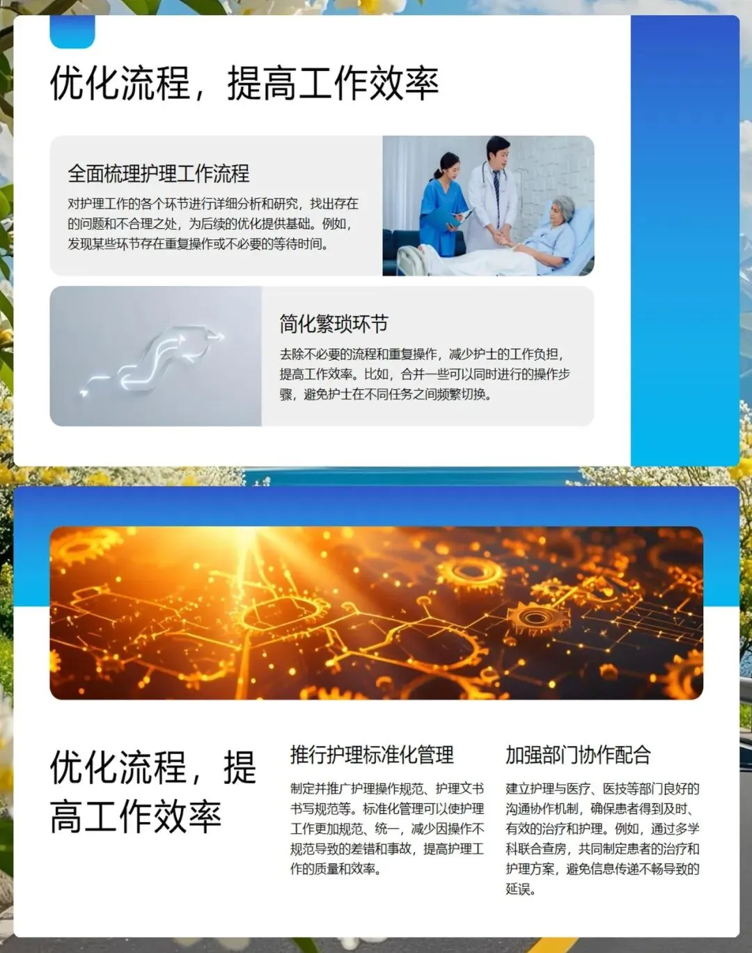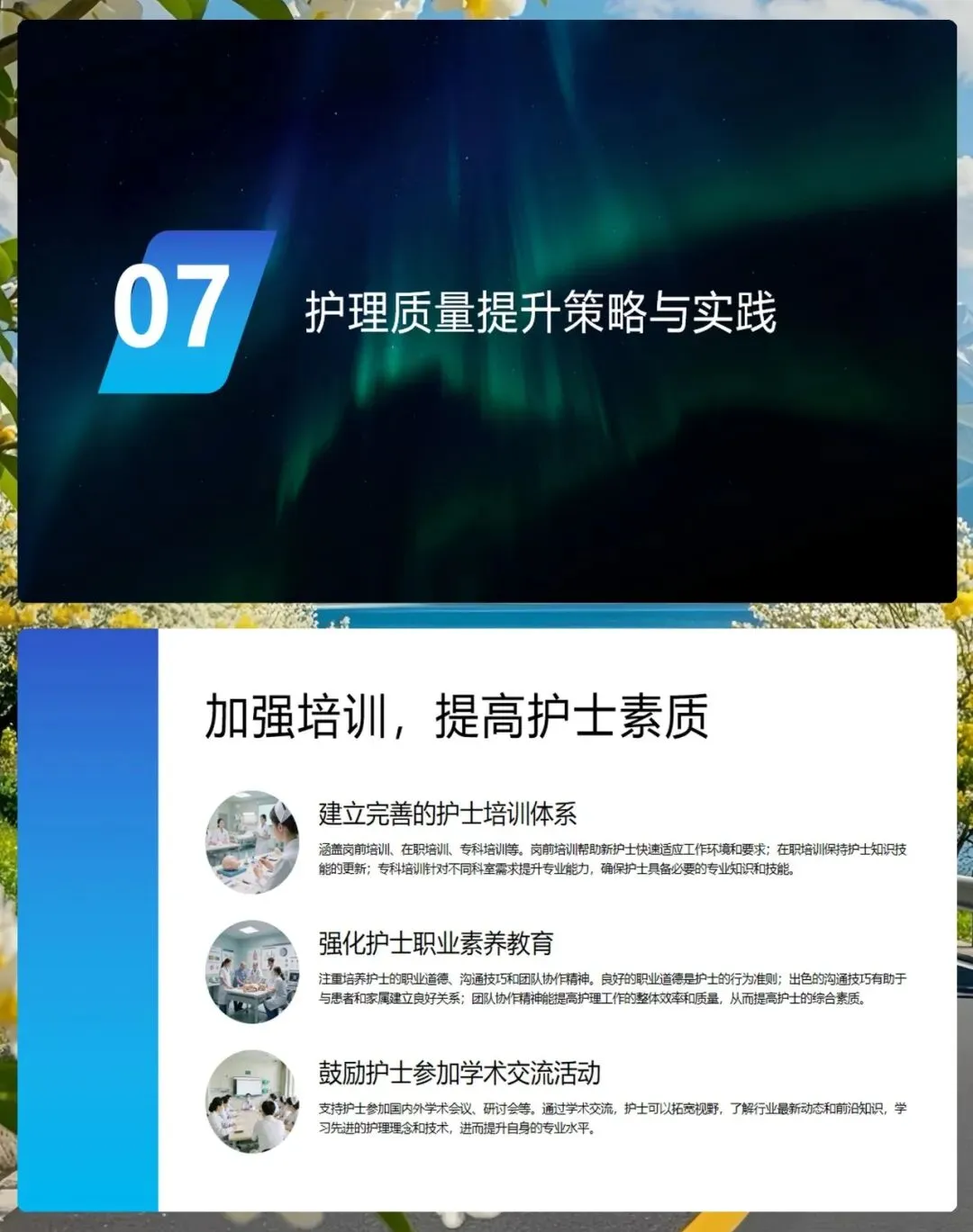 为了不断提升护理质量,我们还需要加强培训,建立完善的岗前、在职和专科培训体系,提升护士的职业素养。