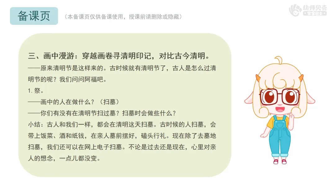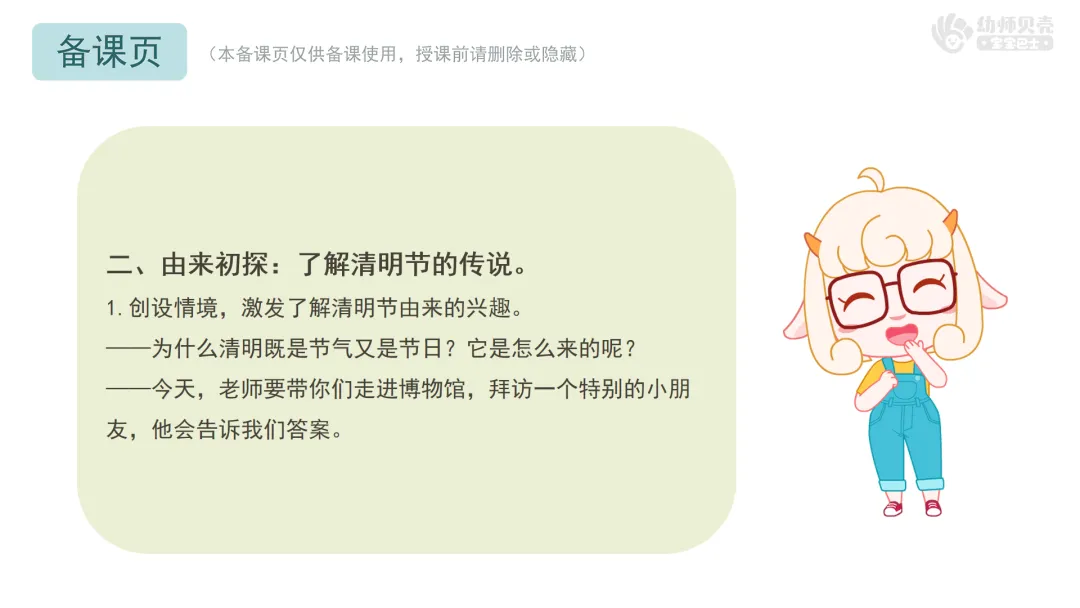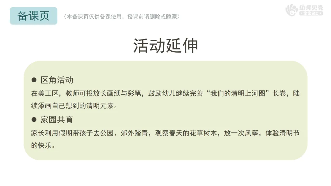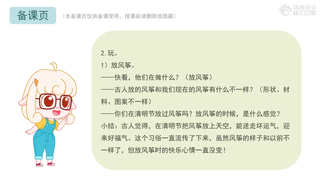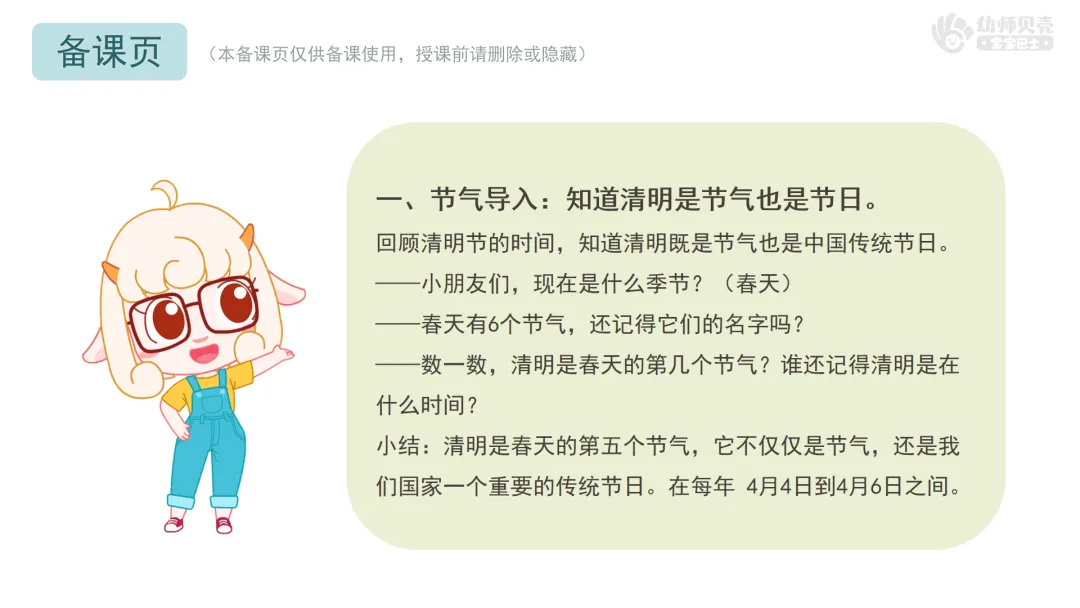 l经验准备:1.幼儿有和家人一起过清明节的经历。2.幼儿对春天的节气有初步了解。