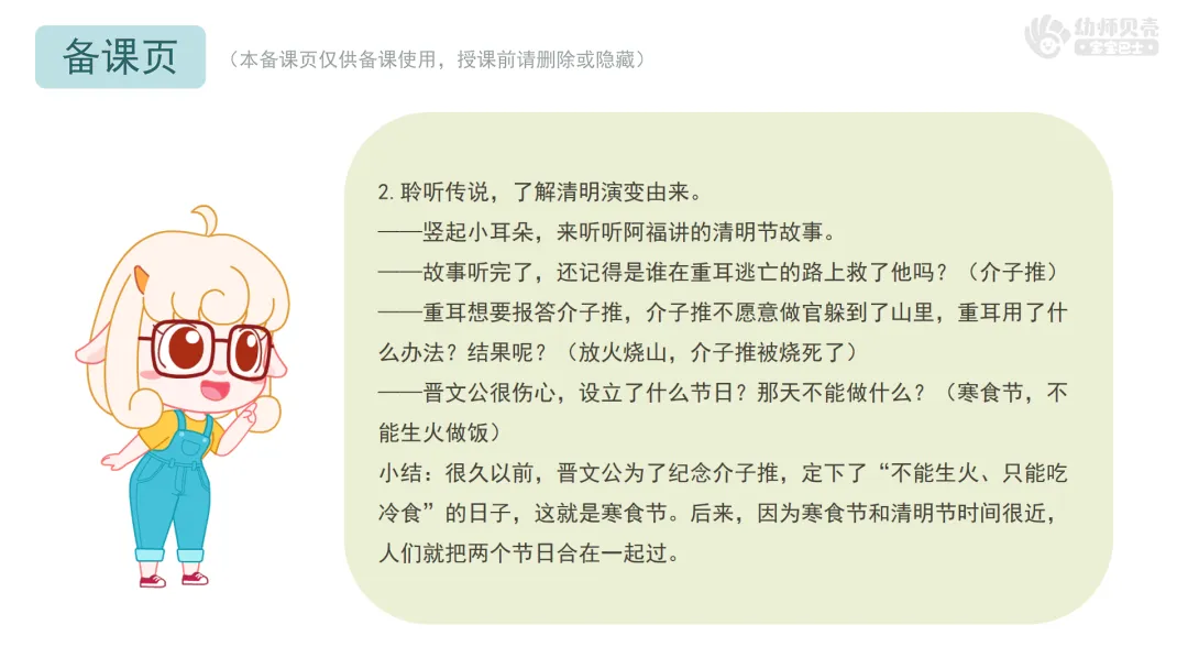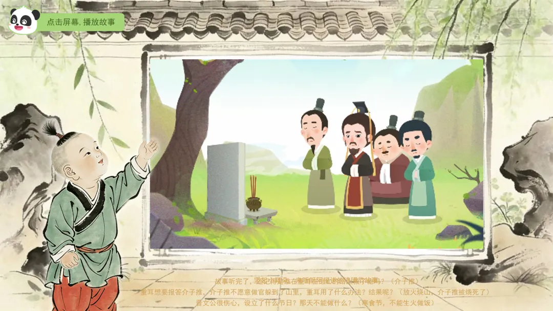 小结:很久以前,晋文公为了纪念介子推,定下了“不能生火、只能吃冷食”的日子,这就是寒食节。后来,因为寒食节和清明节时间很近,人们就把两个节日合在一起过。