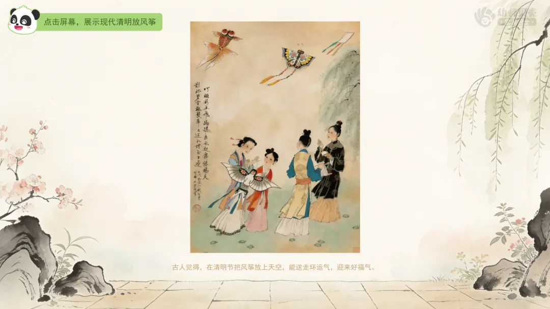 小结:古人觉得,在清明节把风筝放上天空,能送走坏运气,迎来好福气。这个习俗一直流