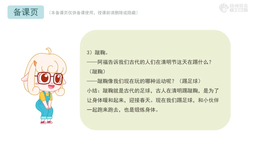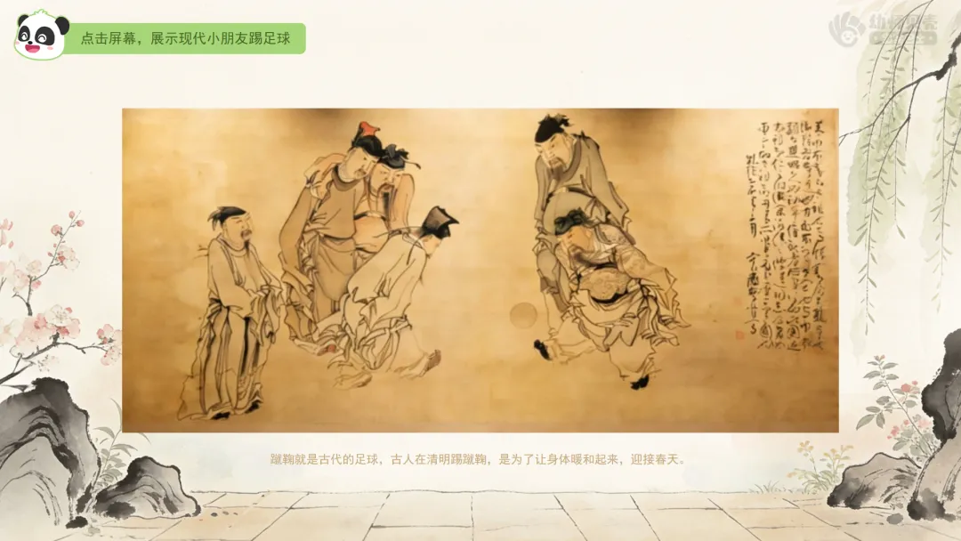 小结:蹴鞠就是古代的足球,古人在清明踢蹴鞠,是为了让身体暖和起来,迎接春天。现在