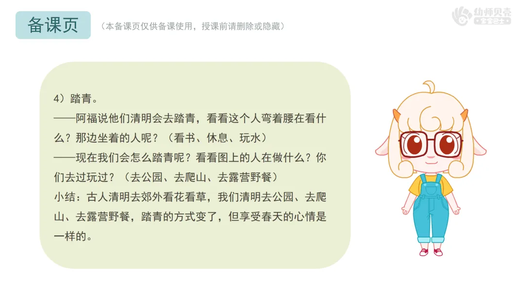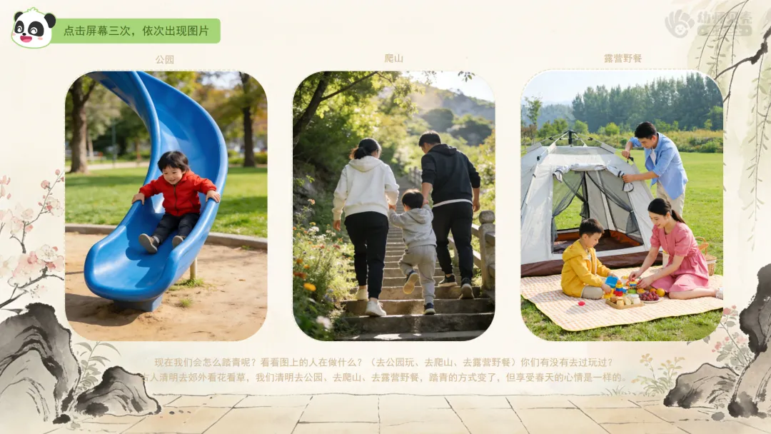 小结:古人清明去郊外看花看草,我们清明去公园、去爬山、去露营野餐,踏青的方式变了,