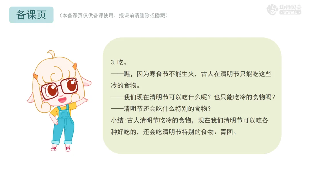 小结:古人清明节吃冷的食物,现在我们清明节可以吃各种好吃的,还会吃清明节特别的食物: