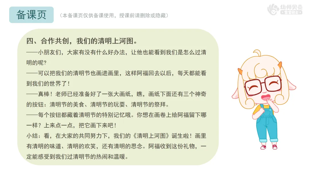小结:看,在大家的共同努力下,我们的《清明上河图》诞生啦!画里有清明的味道、清明的欢笑,还有清明的思念。阿福收到这份礼物,一定能感受到我们过清明节的热闹和温暖。