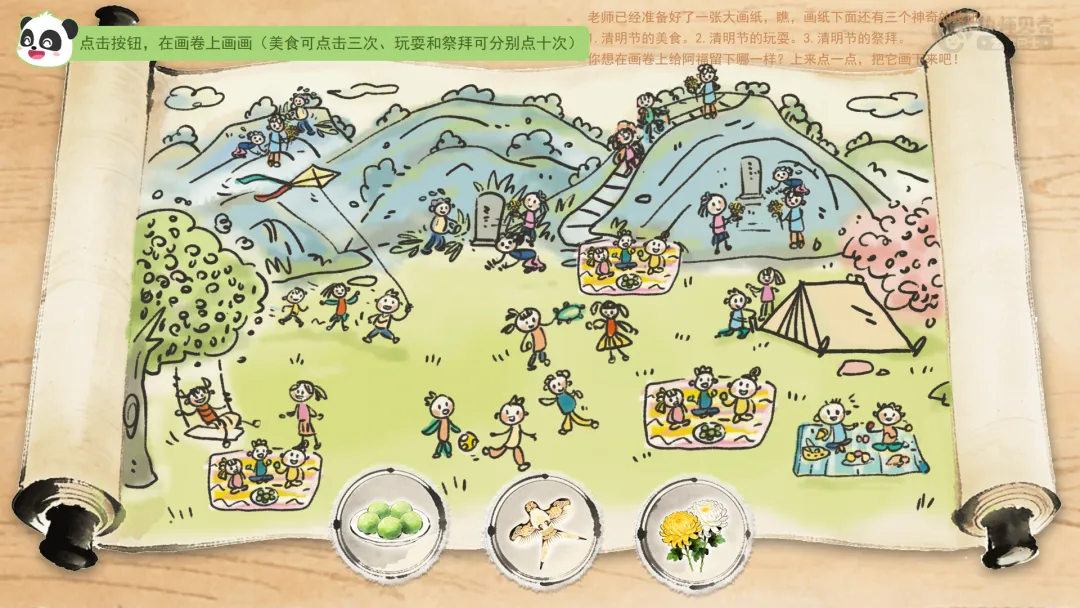 ——真棒!老师已经准备好了一张大画纸,瞧,画纸下面还有三个神奇的按钮:清明节的美食、清明节的玩耍、清明节的祭拜。