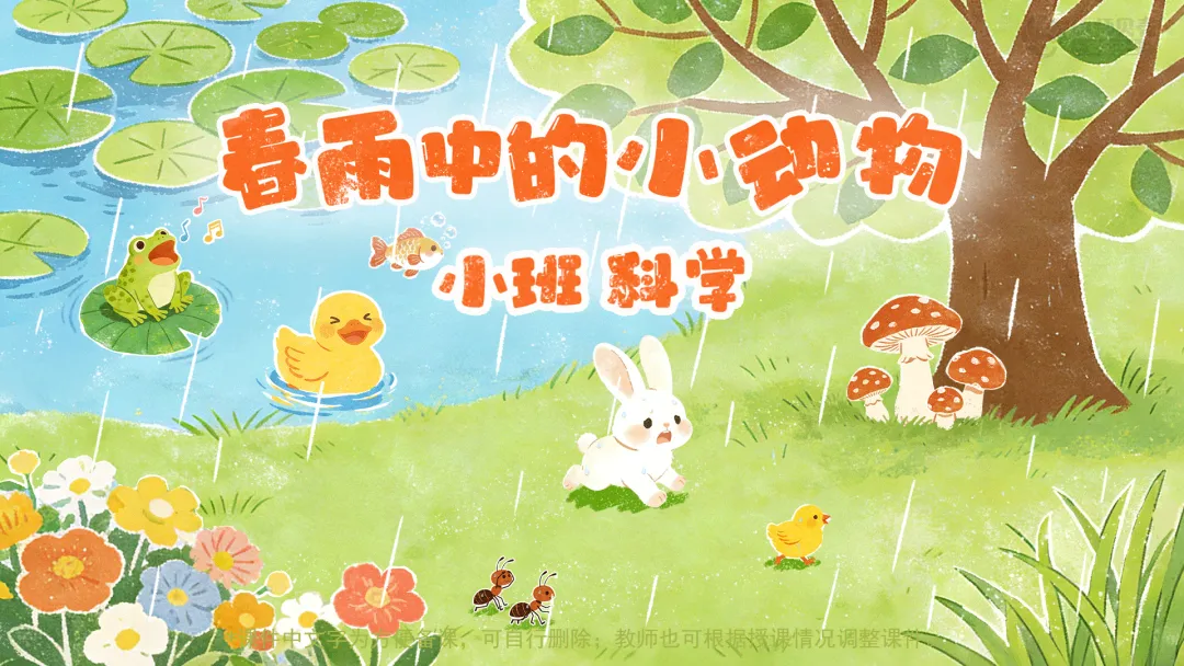 l课件准备:《春雨中的小动物》课件。