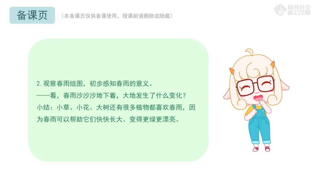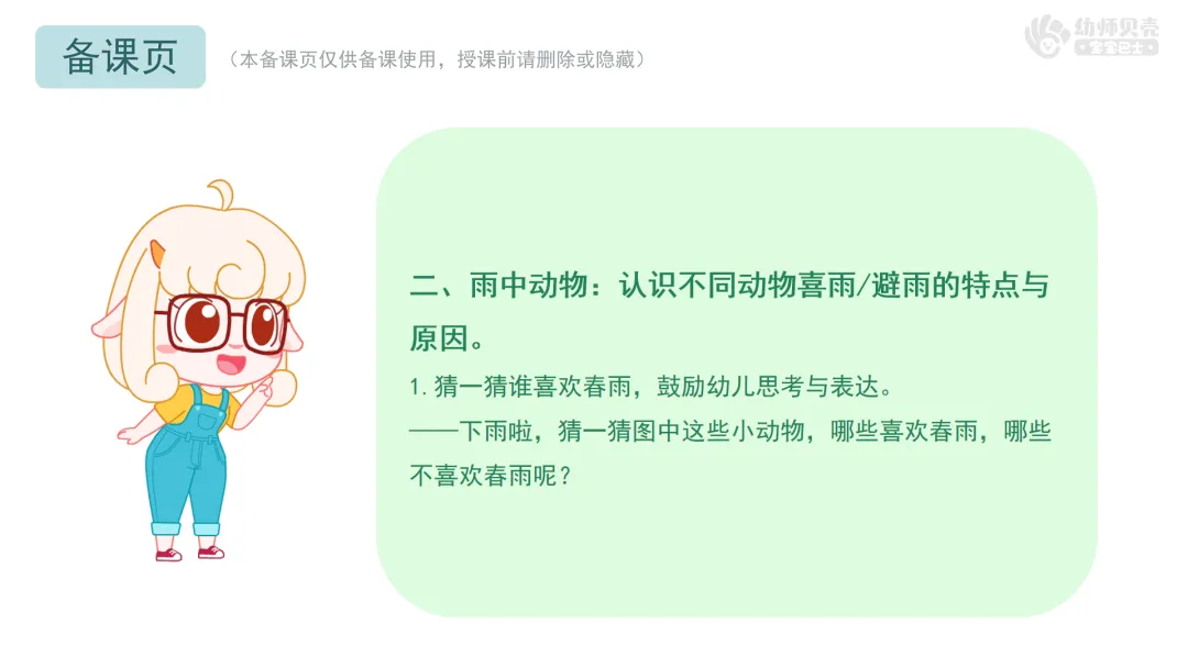1.猜一猜谁喜欢春雨,鼓励幼儿思考与表达。