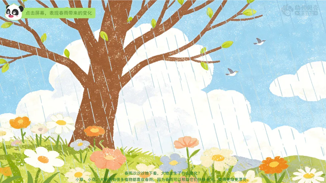 小结:小草、小花、大树还有很多植物都喜欢春雨,因为春雨可以帮助它们快快长大、变得更绿更漂亮。
