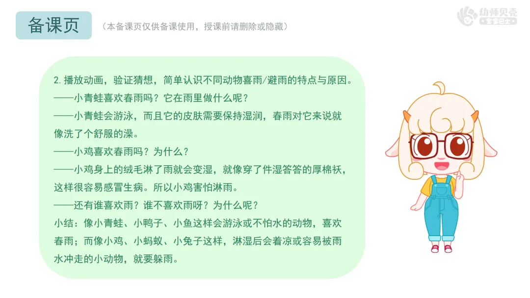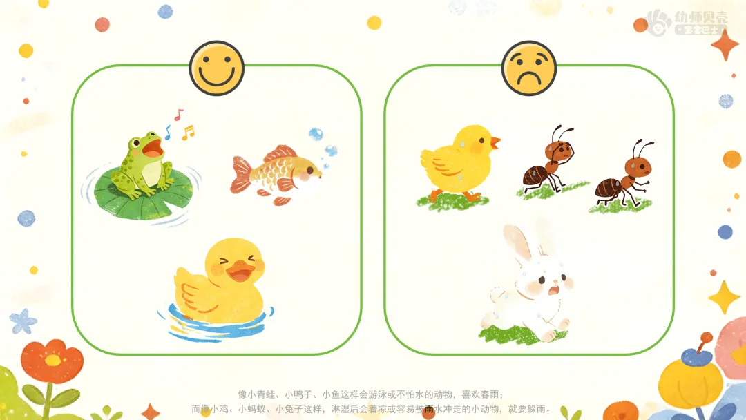 小结:像小青蛙、小鸭子、小鱼这样会游泳或不怕水的动物,喜欢春雨;而像小鸡、小蚂蚁、小兔子这样,淋湿后会着凉或容易被雨水冲走的小动物,就要躲雨。