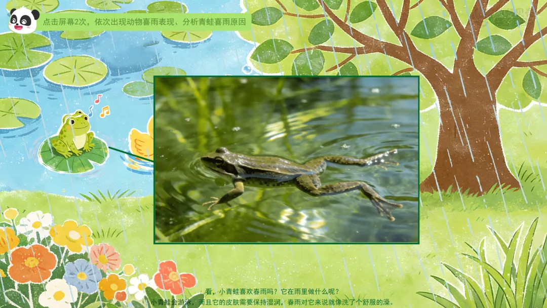 ——小青蛙会游泳,而且它的皮肤需要保持湿润,春雨对它来说就像洗了个舒服的澡。
