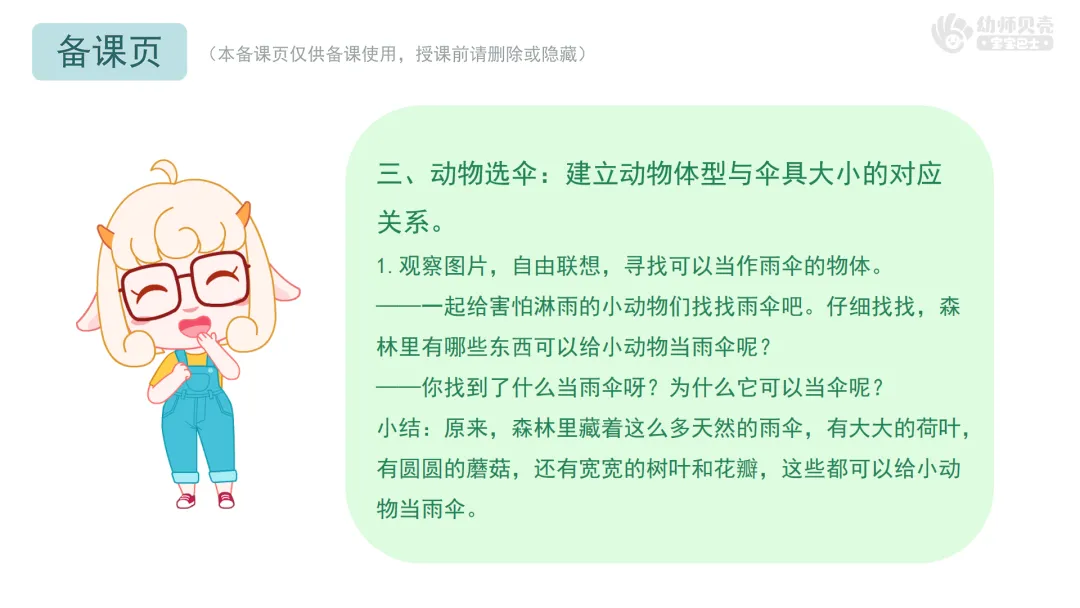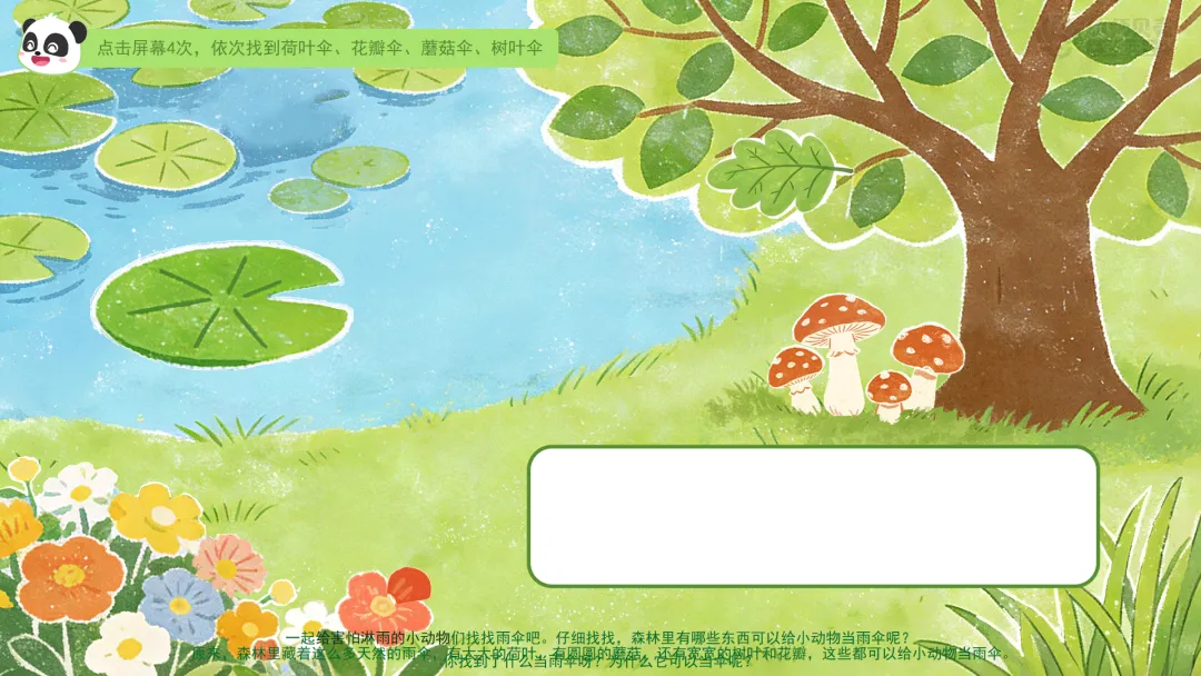 小结:原来,森林里藏着这么多天然的雨伞,有大大的荷叶,有圆圆的蘑菇,还有宽宽的树