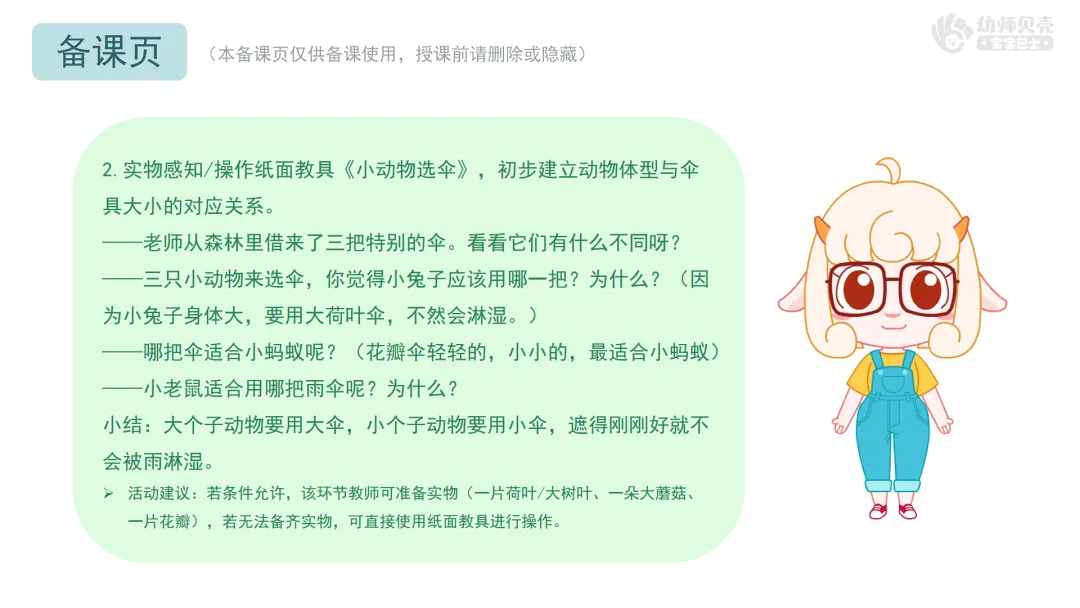 l重点:感受春雨的特点,初步感知“大动物用大伞,小动物用小伞”的对应关系。