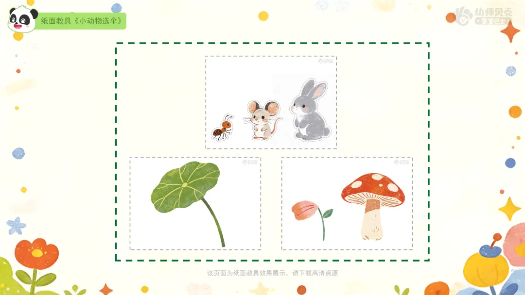 Ø活动建议:若条件允许,该环节教师可准备实物(一片荷叶/大树叶、一朵大蘑菇、一片花瓣),若无法备齐实物,可直接使用纸面教具进行操作。