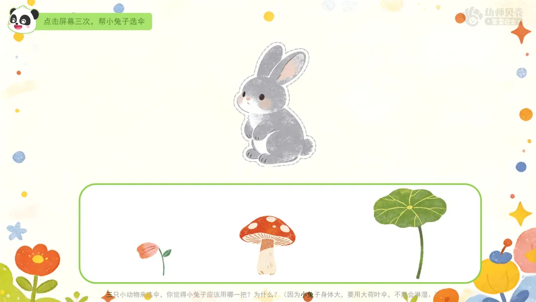 ——三只小动物来选伞,你觉得小兔子应该用哪一把?为什么?(因为小兔子身体大,要