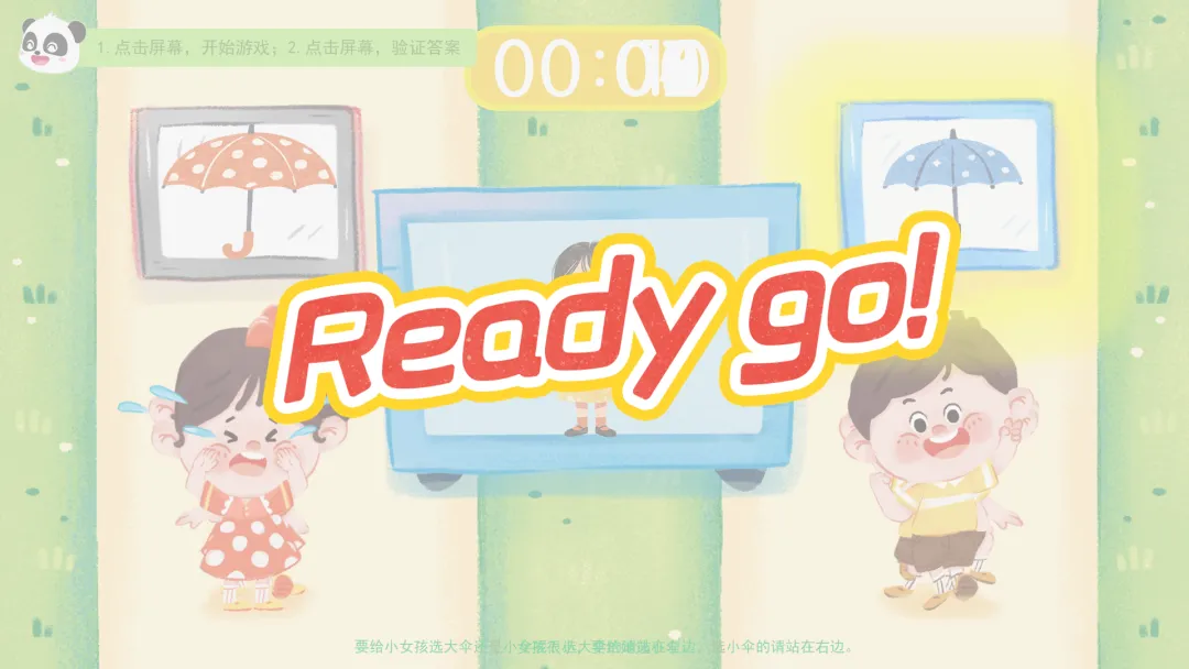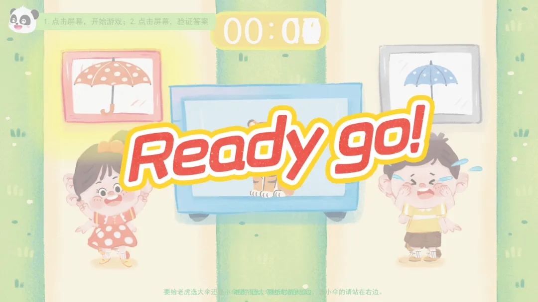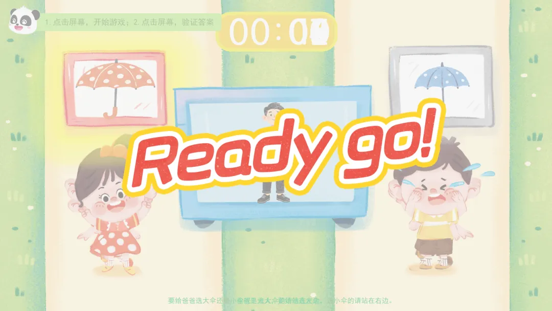 Ø活动建议:游戏开始,教师引导幼儿观察屏幕中间的人物/动物体型大小并站在大伞/小伞的对应位置做出选择。
