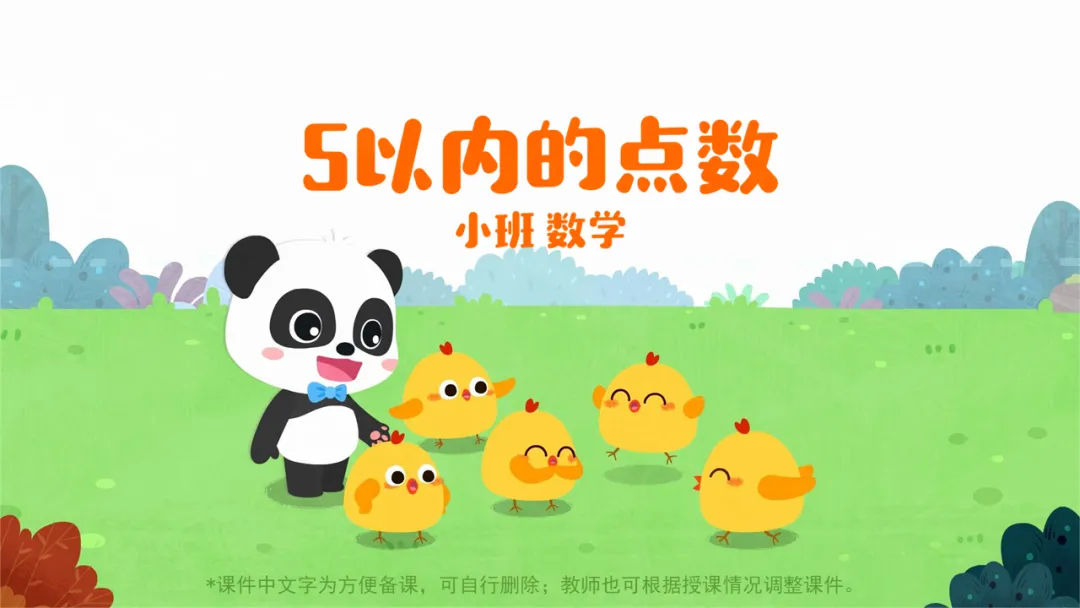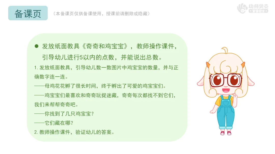 l发放纸面教具《奇奇和鸡宝宝》,教师操作课件,引导幼儿进行5以内的点数,并能说出总数。