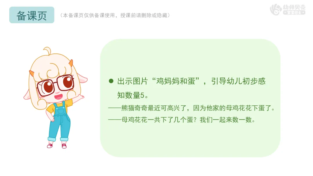 l出示图片“鸡妈妈和蛋”,引导幼儿感知数量5。