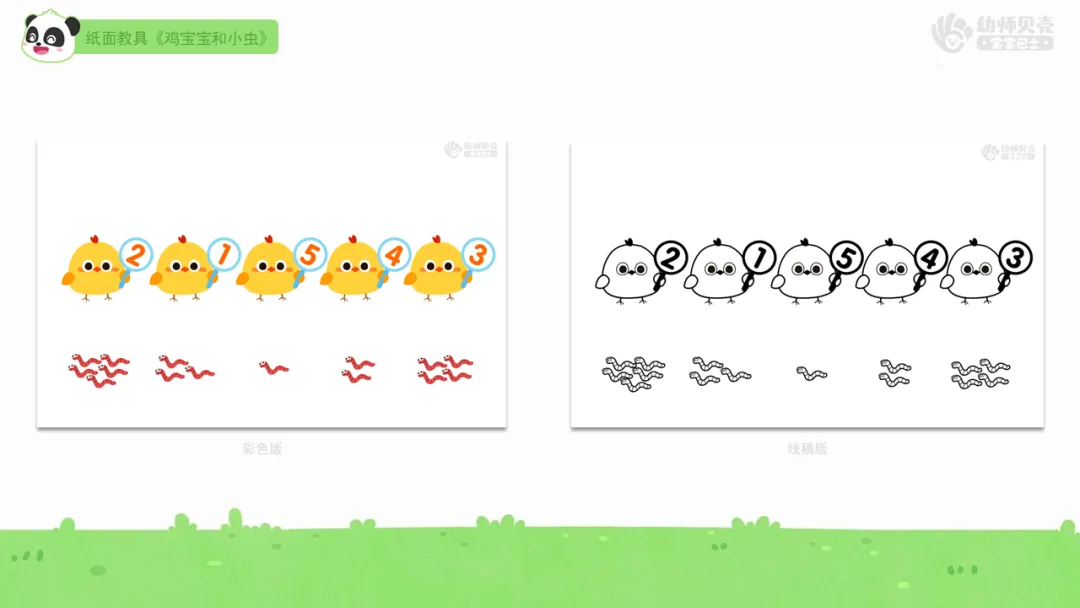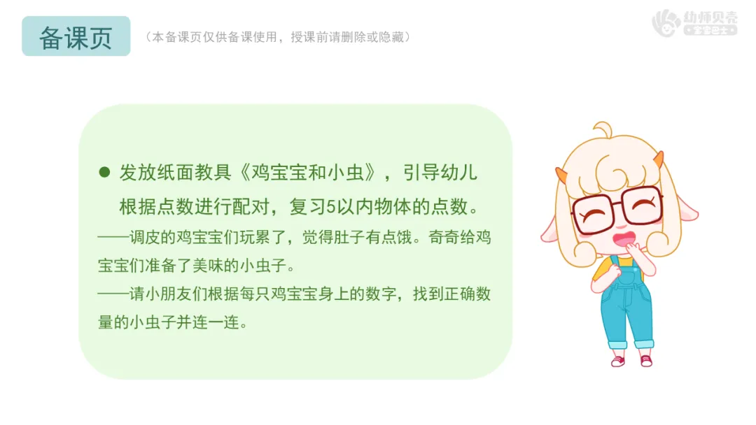 l发放纸面教具《鸡宝宝和小虫》,引导幼儿根据点数进行配对,复习5以内物体的点数。