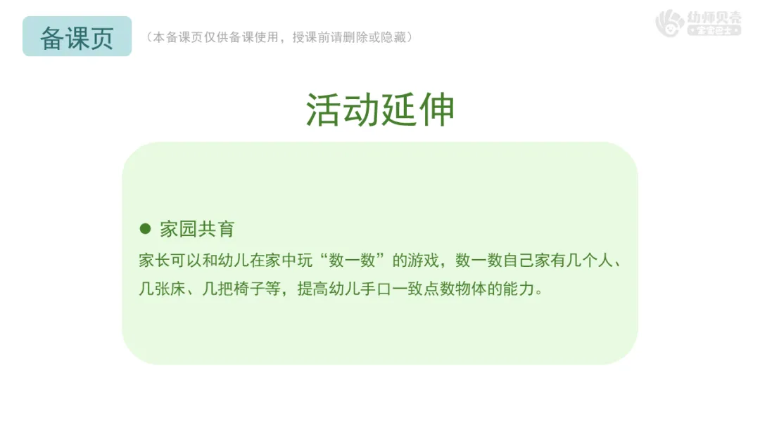 家长可以和幼儿在家中玩“数一数”的游戏,数一数自己家有几个人、几张床、几把椅子等,提高幼儿手口一致点数物体的能力。