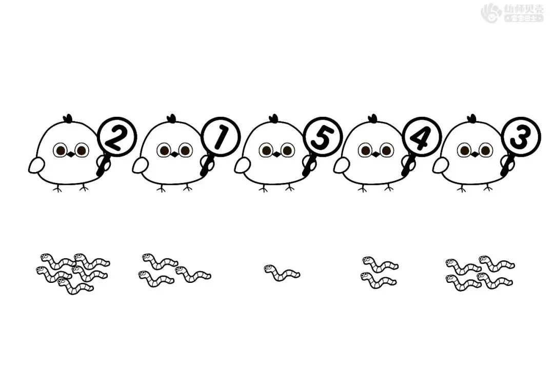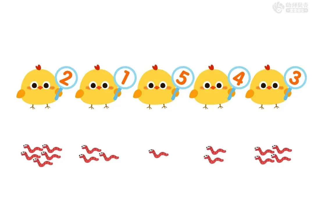 ——请小朋友们根据每只鸡宝宝身上的数字,找到正确数量的小虫子并连一连。