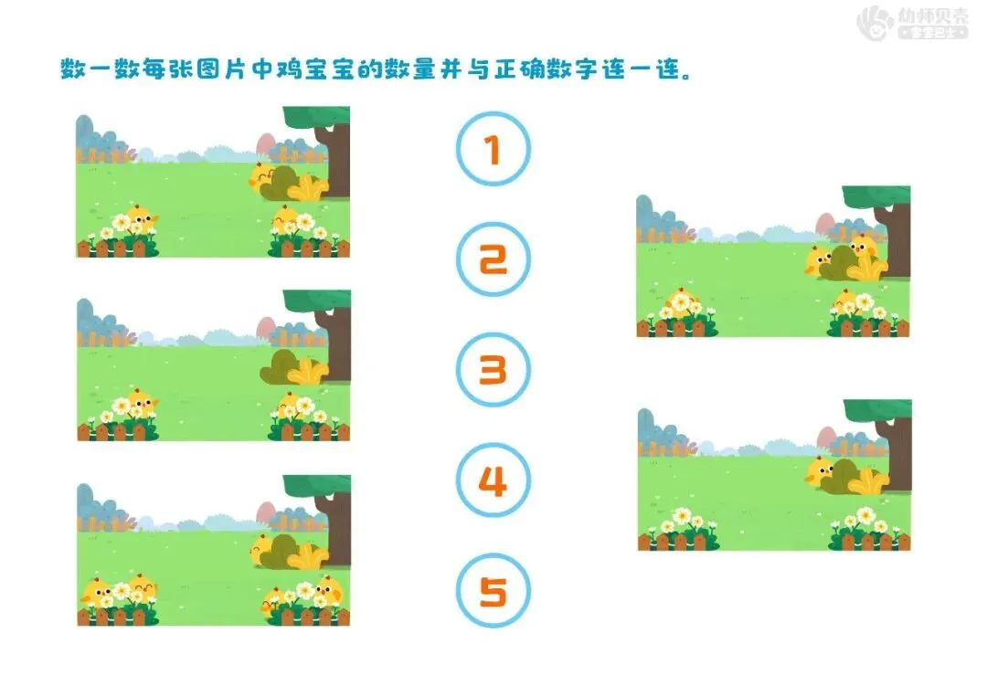 1.发放纸面教具,引导幼儿数一数图片中鸡宝宝的数量,并与正确数字连一连。