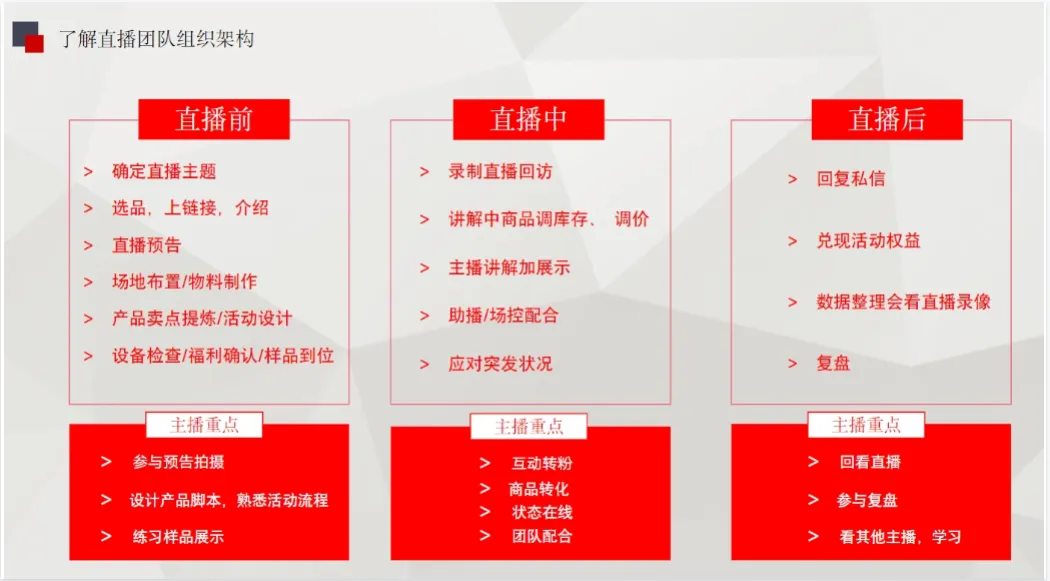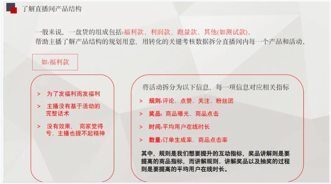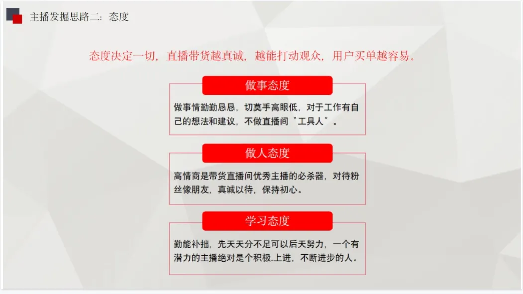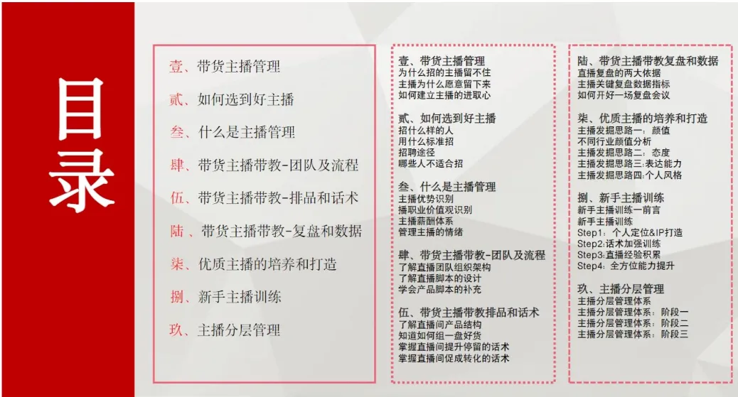 这套:直播带货主播培训课件23份合集,为新主播提供了从入门到精通的全流程系统化知识体系,涵盖直播技巧、话术设计、互动策略等核心技能,帮助其快速建立专业能力框架。对于已有经验的主播,该合集可作为关键的提升工具,通过提供新的营销思路、数据分析方法和实战案例,助其突破瓶颈,实现从“会播”到“精播”的进阶。统一的培训课件能确保培训质量的稳定性与内容的一致性,使不同背景的学员都能接受到高标准、高质量的专业指导,有利于行业人才标准的初步形成。该合集内容全面,覆盖了主播能力提升的各个方面,如《主播临场应对策略30例》能增强突发状况处理能力,《主播中级在线憋单话术逻辑脚本》和《主播高级憋单和单品话术逻辑脚本》则专门针对提升成交转化设计,而《电商带货主播培训手册-138页》等资料提供了深厚的理论基础。这种系统性的资源整合极大地降低了从业者的学习门槛与试错成本。同时,课件合集便于持续更新和优化,能够紧跟直播电商行业的快速发展趋势,及时纳入最新的平台规则、算法机制和成功案例,为从业者持续赋能,避免因信息滞后而落后于市场。最终,这套完备的培训资料有助于推动整个直播带货行业向更加专业化、规范化的方向发展,通过提升主播群体的整体素养,来增强消费者信任,促进行业的长期健康与繁荣。