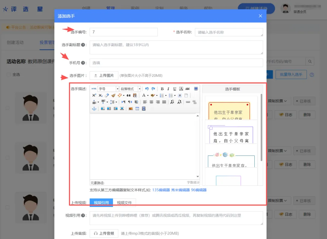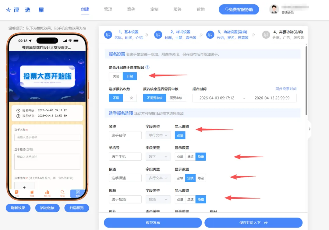 想要确保本次教师原创课件设计大赛投票评选活动顺利进行下去,这里推荐免费好用的评选星投票制作平台。该平台可灵活上传 PPT、微课视频等多种形式课件,还兼具防刷票、数据实时统计、自定义展示样式等功能,能够简化参赛与投票流程,既保障评选公平公正,又助力活动高效有序开展,充分展现教师课件设计风采。