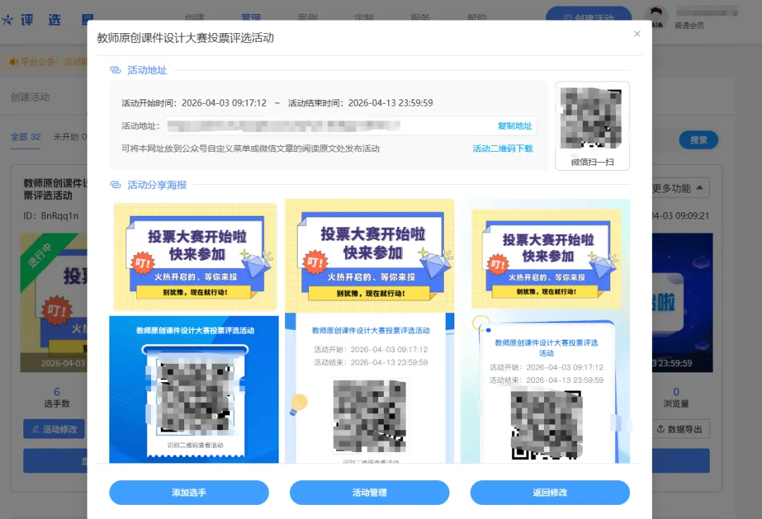 4、最后根据评选星平台生成的专属投票链接、二维码和海报,去各位网络平台宣传分享以及转发即可。