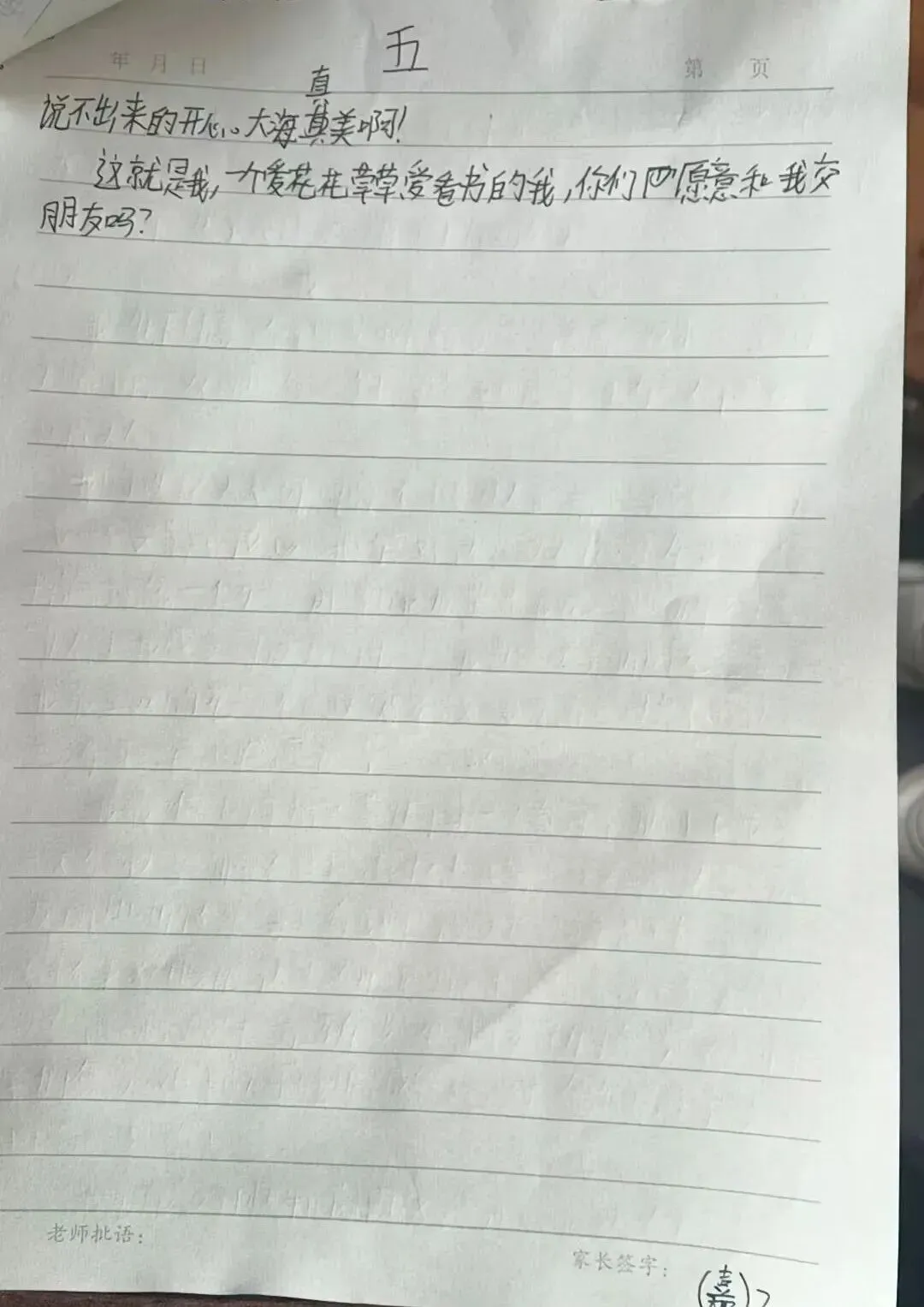 效果自评:三、四年级同学是没有做过沙盘游戏的,但这一次做的沙盘作文给了意外惊喜,他们写的都特别的好,三年级开始有点领悟慢,给他个别辅导了以后马上进步了,字体好多了,字数多写了一半。四年级同学特别跟节奏,有话可叙。从一张半写到三大张。5年级是我一直带着的。太让我有成就感了。